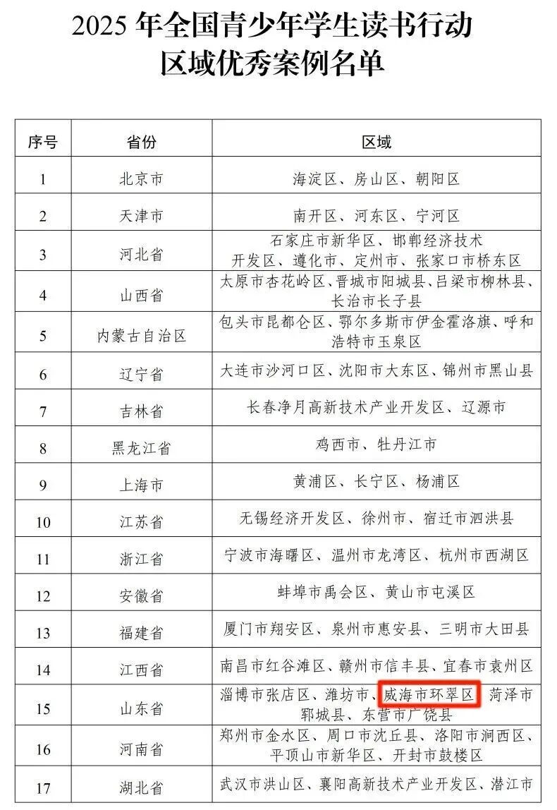 近日,教育部公布2025年全国青少年学生读书行动区域优秀案例名单,我市环翠区“书香校园”建设案例从入选的99个案例中脱颖而出,成为全省5个获此殊荣的区域之一。