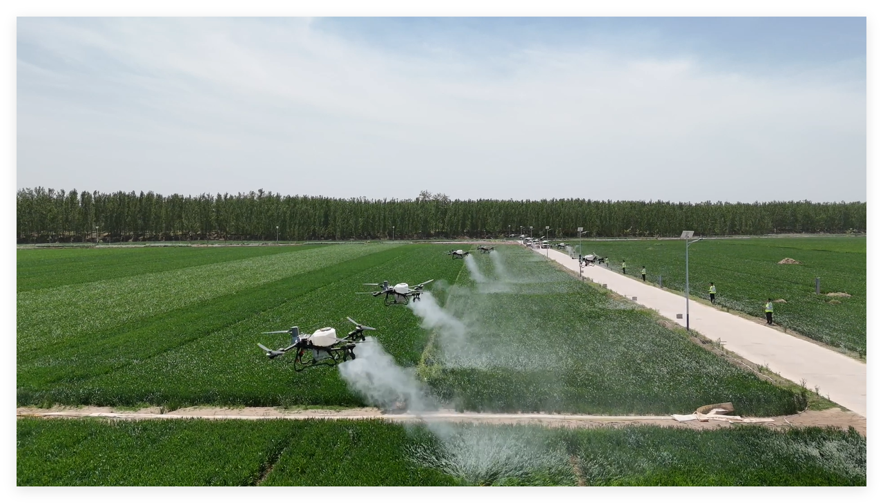 会议现场,20多架植保无人机整齐列队、依次升空,在操作人员的精准操控下,沿着预设航线在麦田上空平稳穿梭。调配好的药剂均匀细密地喷洒在小麦茎叶上,一次性完成病虫害防控、防干热风、防早衰三项核心任务,化身守护百万亩麦田的“科技尖兵”,场面震撼又提气。