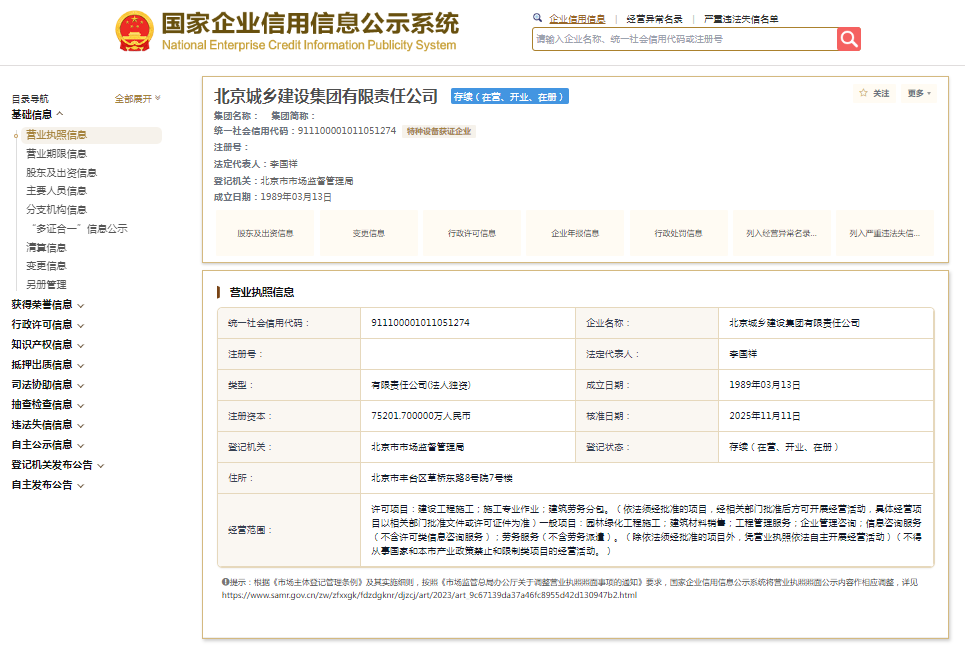 国家企业信用信息公示系统显示,北京城乡建设集团有限责任公司成立于1989年,注册资本75201.7万元人民币,法定代表人为李国祥,由北京建工集团有限责任公司全资持股。