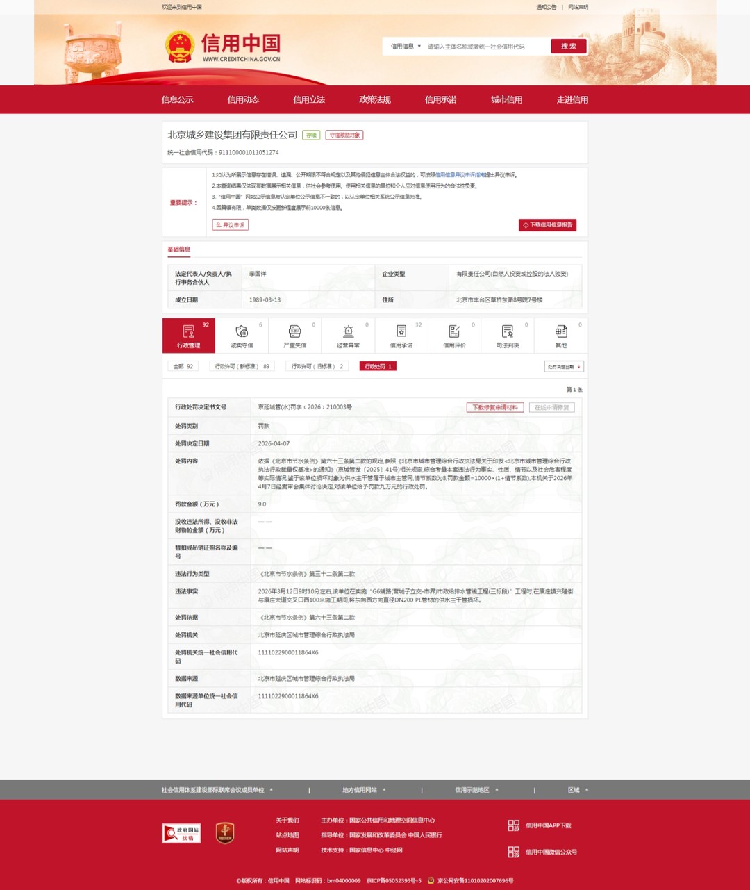 齐鲁晚报·齐鲁壹点记者于信用中国行政处罚栏获悉,4月7日,北京城乡建设集团有限责任公司(下称“北京城乡建设集团”)被行政处罚,罚款金额9万元,处罚机关是北京市延庆区城市管理综合行政执法局。处罚决定书文号:京延城管(水)罚字﹝2026﹞210003号。