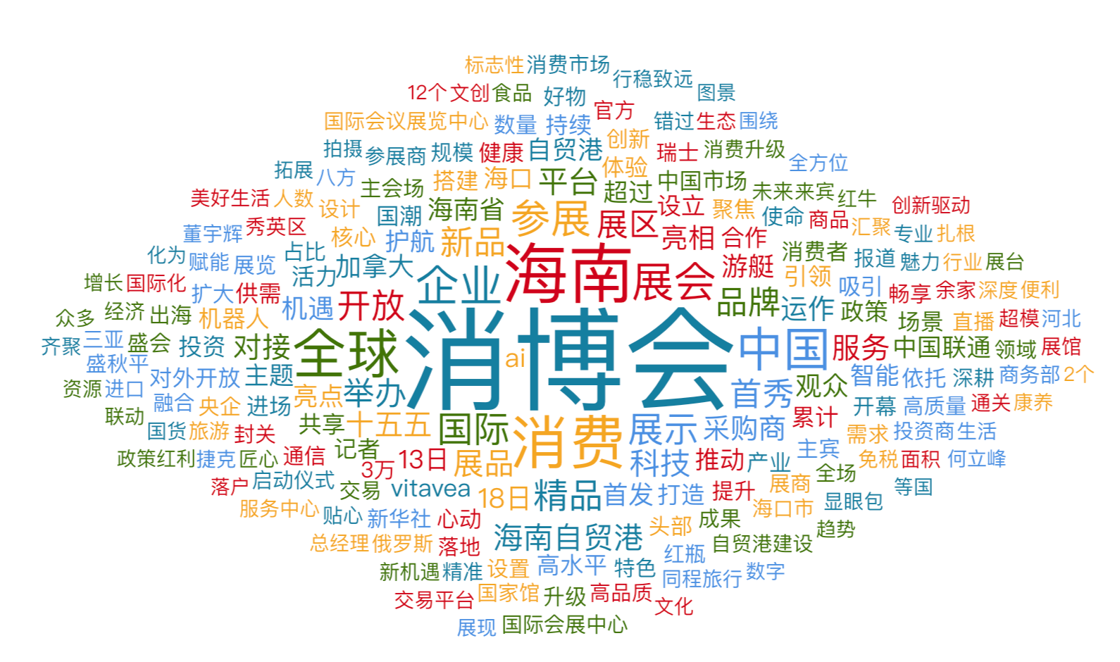 词云图可以反映传播内容的聚焦点及其与活动主题的契合情况。有关第六届中国国际消费品博览会的全网传播内容词云图如下,其中关键词“消博会”的提及量排名第一,提及次数为126333次;关键词“海南”的提及量排名第二,提及次数为64304次;“消费”的提及量排名第三,提及次数为54494次。此外,“全球、中国、企业、展会、参展、国际、展示”等都是提及量排名前十的热词。