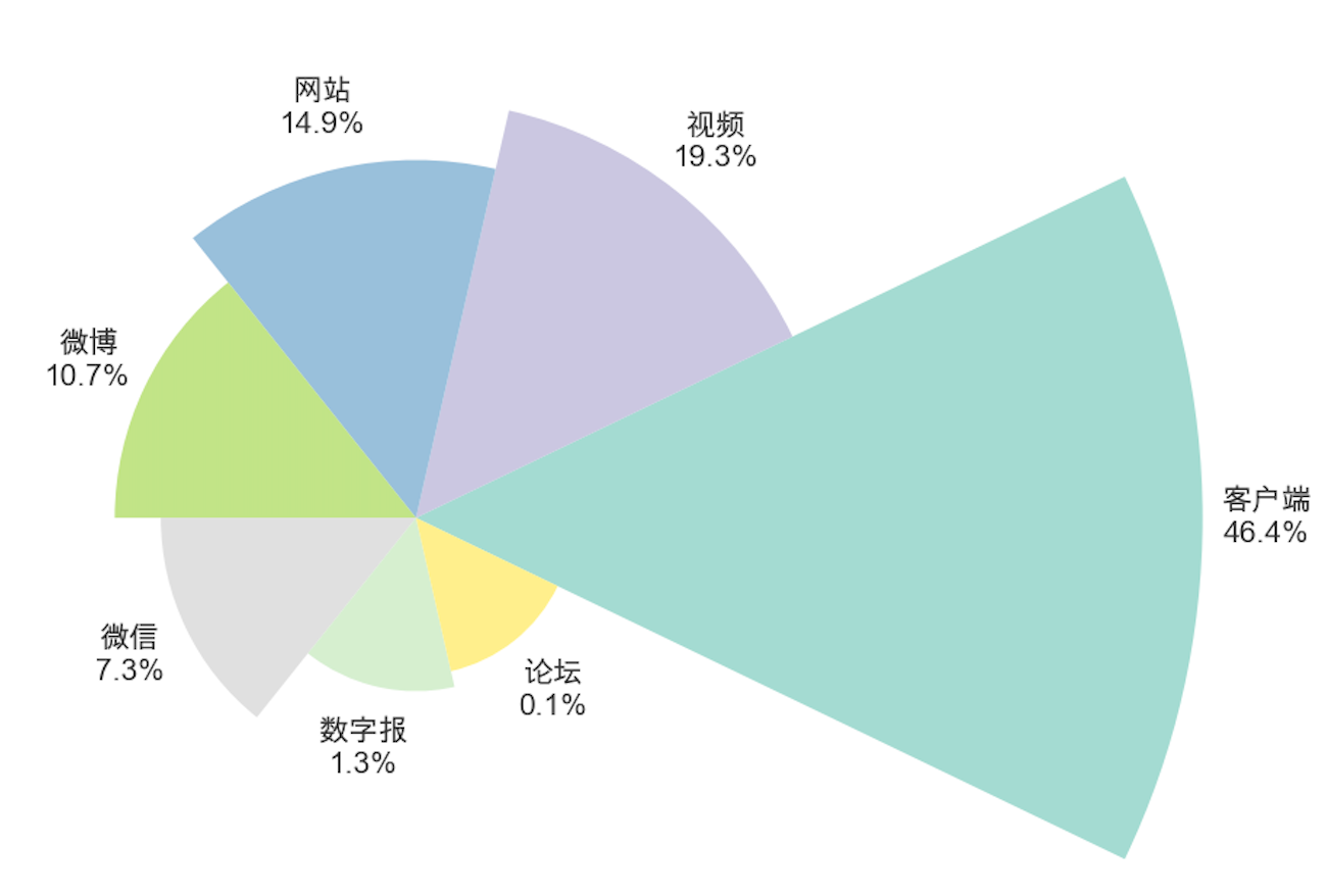 全网196116条传播信息中,来自客户端的信息有90938条,来自网站的29173条,微博21003条,微信14358条,视频37817条,数字报2565条,互动论坛262条。信息传播量最大的渠道是客户端。客户端和网站的信息数量占比达61.24%,说明主流媒体在第六届中国国际消费品博览会的信息传播中起到了重要的推动作用。