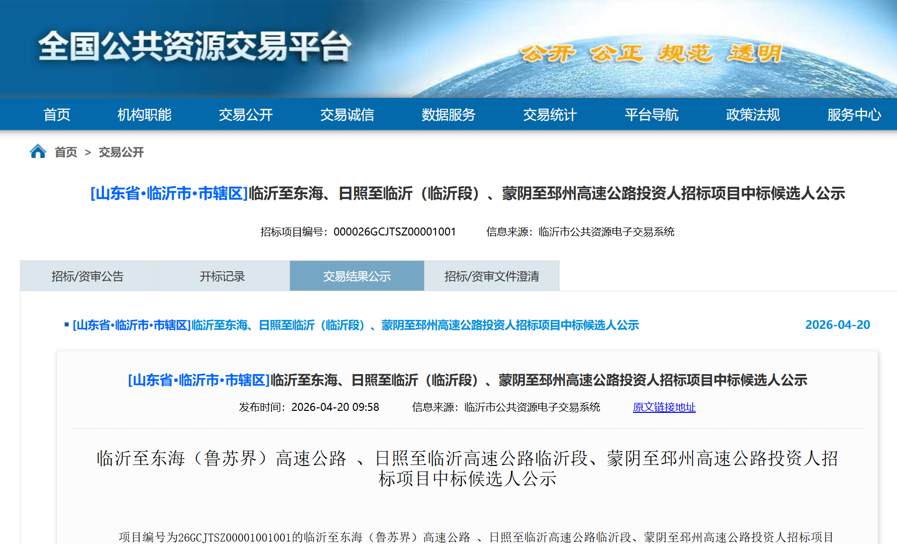 4月20日,临沂至东海、日照至临沂(临沂段)、蒙阴至邳州高速公路投资人招标项目中标候选人公示。