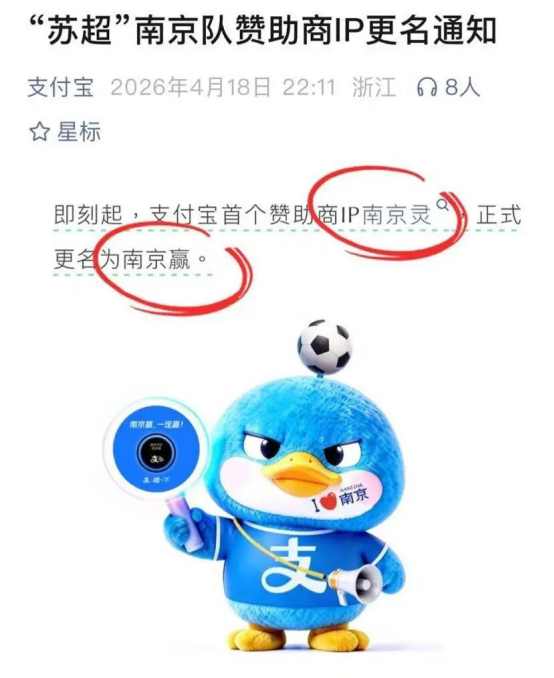 苏超新赛季,上届“三甲”球队首轮集体“翻车”,一球未进。网友调侃南京队主赞助商的IP形象名字“不吉利”,赞助商连夜改名。