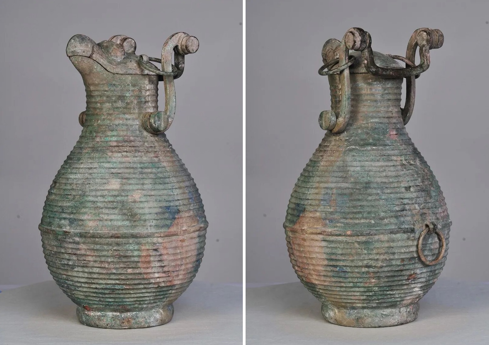 从新石器时代的各种陶壶,到商周时的青铜壶,壶在日常生活中的重要性不言而喻。山东省淄博市辛店二号墓出土的四件战国早期龙纹青铜壶中,有三个壶里有翠绿色液体,并散发出浓浓的酒曲香气。《诗经》中说“清酒百壶”,可见古人多用壶来盛酒。除了日常使用,铜壶还兼具“藏礼于器”的功用,成为礼制的体现,很多铜壶制作非常讲究。东周初到春秋晚期方壶较流行,春秋末到战国末流行圆壶。