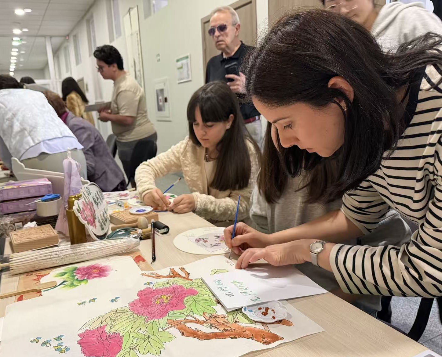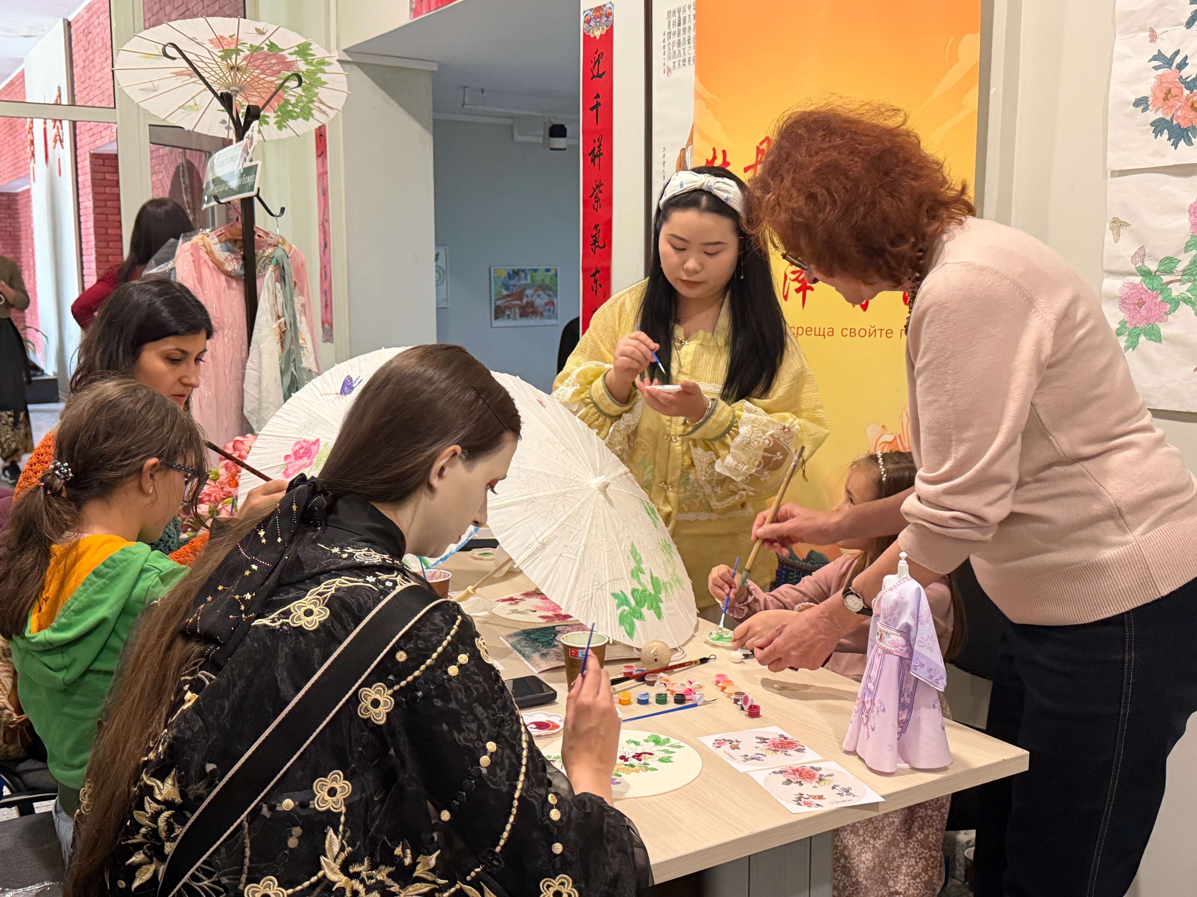 除了静态展示,活动还设置了丰富多样的互动体验环节,牡丹剪纸、牡丹国画绘制、牡丹油纸伞与团扇创作,以及牡丹主题汉服试穿等活动,让当地民众近距离接触、亲身参与,在动手体验中深入了解牡丹文化的内涵,现场互动频繁、欢声笑语不断,受到了当地民众的热烈欢迎。