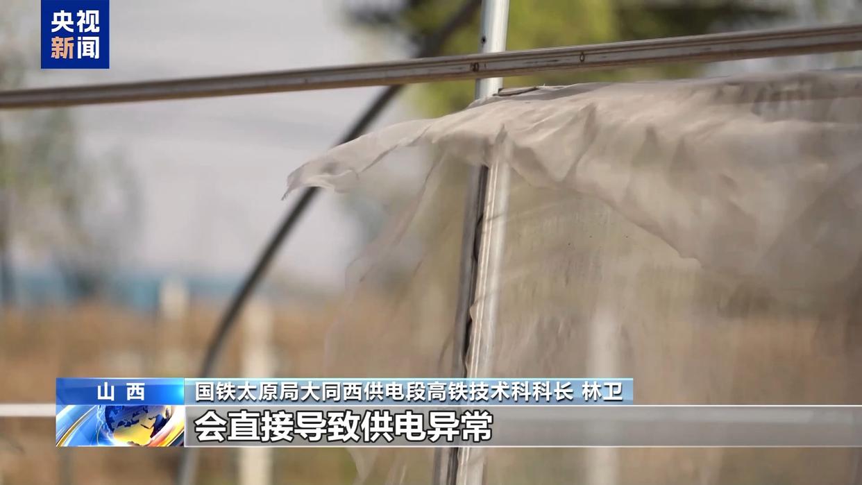 国铁太原局大同西供电段高铁技术科科长 林卫:这样的天气下,铁路沿线的农用塑料薄膜、防尘网,还有野外游玩放飞的风筝、气球等,一旦被大风吹起缠绕在接触网上,会直接导致供电异常,严重时还会损坏机车和供电设备,危及列车运行安全。