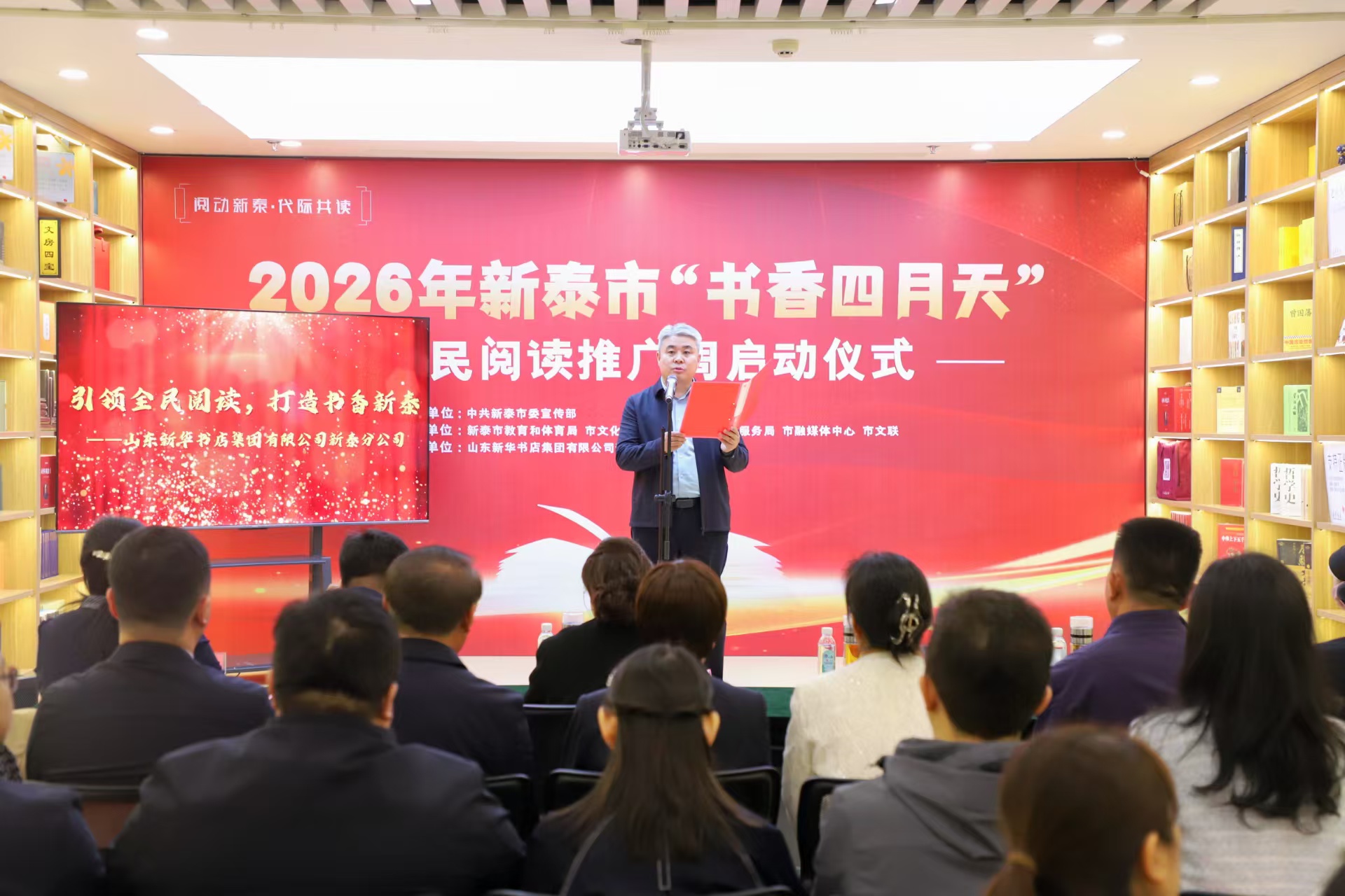 4月21日上午,新泰市新华书店里传来阵阵读书声,“阅动新泰·代际共读”2026年新泰市“书香四月天”全民阅读推广周暨知识产权宣传周系列活动启动仪式在这里举行。本次活动主题聚焦“一老一小”群体,旨在通过代际共读的方式,让阅读融入家庭日常生活。