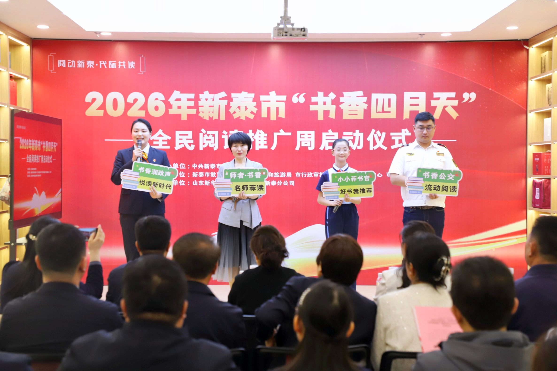 新泰市委常委、宣传部部长周典红在致辞中说,新泰自古就有“耕读传家”“诗书继世”的传统。她希望各级组织和阅读阵地当好“服务员”,把优质图书和活动送到群众家门口;希望党员干部和道德模范当好“领读人”,用榜样的力量带动更多人拿起书本;也希望市民朋友们放下手机,捧起书本,让读书声成为家庭里美好的背景音。随后,“‘阅动新泰·代际共读’2026年新泰市‘书香四月天’全民阅读推广周系列活动正式启动。”