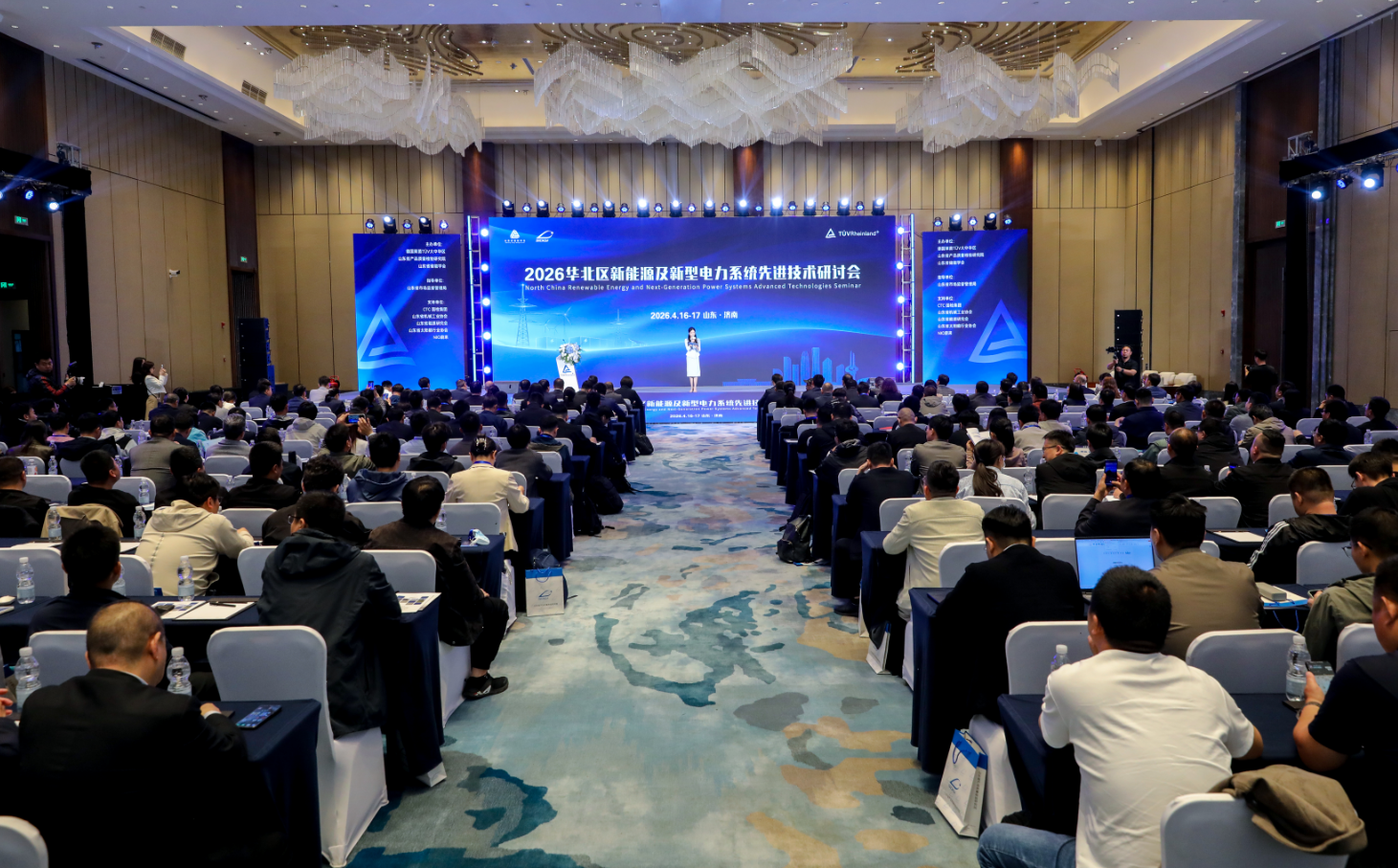 4月16日至17日,在山东省市场监督管理局指导下,以“赋能新型电力系统 共筑绿色能源生态”为主题的2026华北区新能源及新型电力系统先进技术研讨会在济南举办。本次会议由德国莱茵TÜV大中华区、山东省产品质量检验研究院、山东省储能学会联合主办,CTC国检集团、山东省机械工业协会、蔚来汽车、天津工程机械研究院等单位协办,吸引了来自省内外新能源企业、科研机构及行业组织的400余名代表参会。