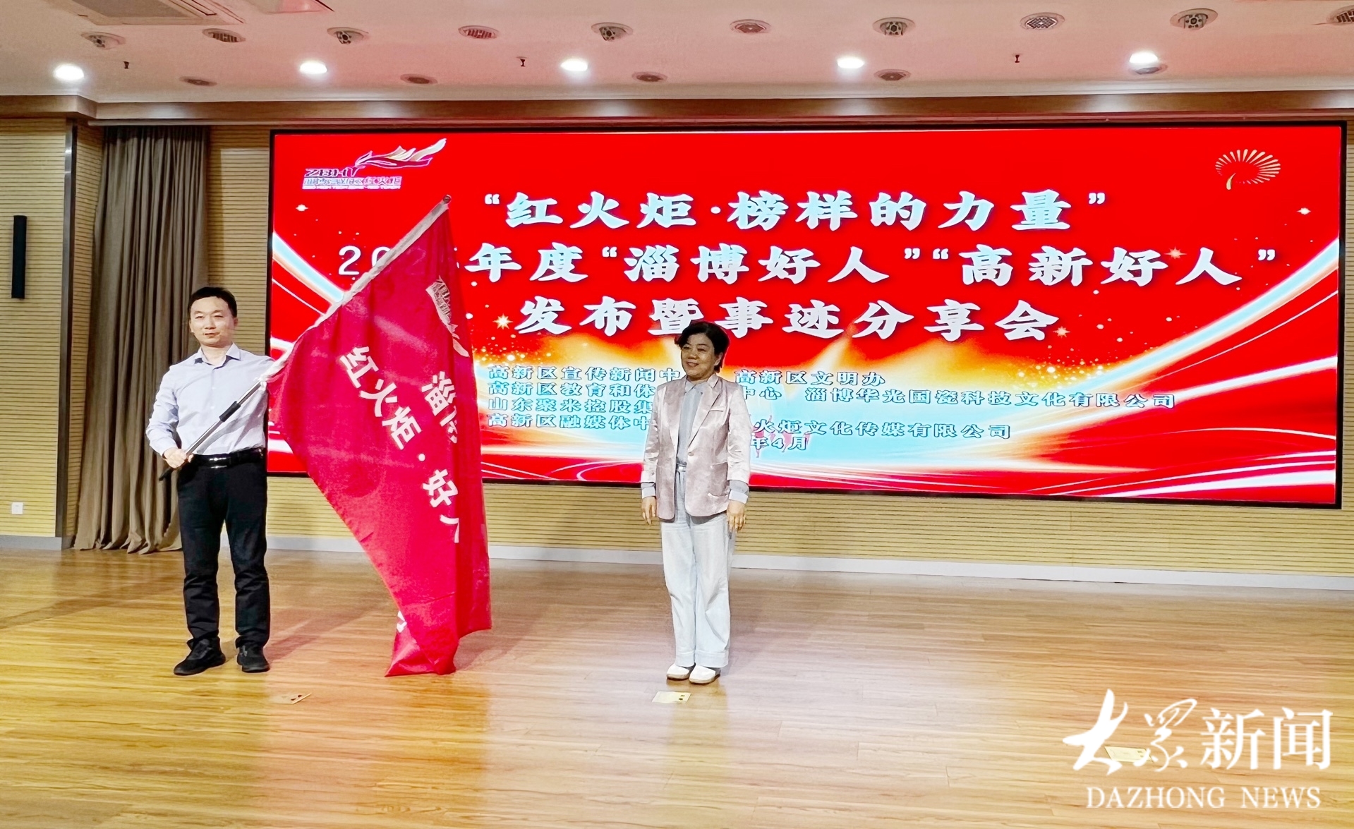 为让榜样的力量传播得更远更广,活动现场正式成立了“红火炬·淄博高新好人宣讲团”。宋卫为宣讲团授旗,宣讲团代表张勇接旗。王飞在讲话中充分肯定了好人们的先进事迹,并向淄博高新区广大干部群众发出向榜样学习的动员令。
