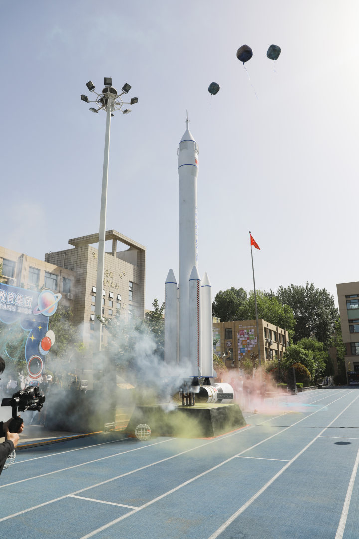 随后,活动迎来激动人心的时刻。在现场各位领导与嘉宾的共同助力下,高红燕校长在指挥台上下达“点火”指令,“和燕号”火箭模型腾空而起,现场掌声雷动!