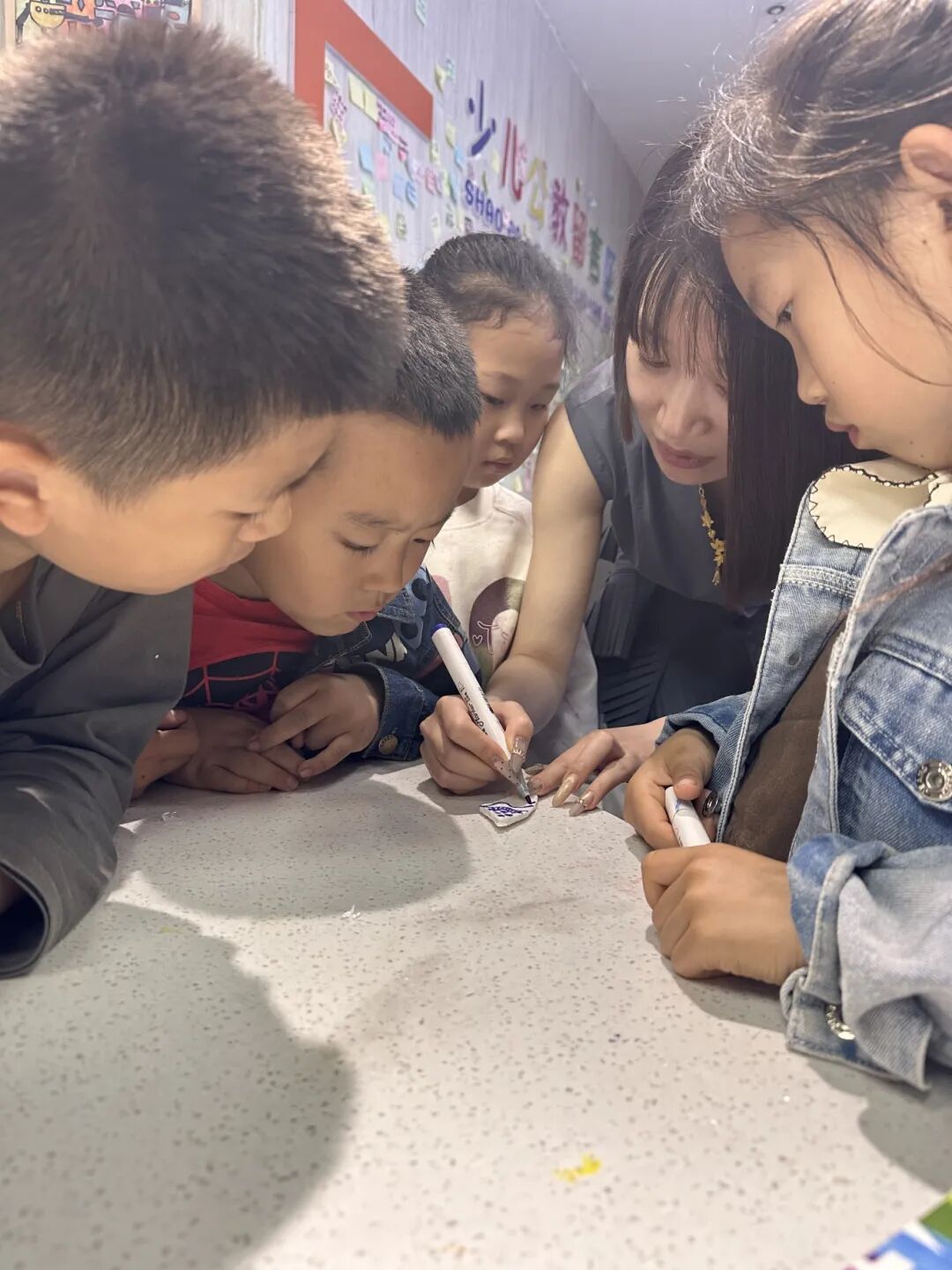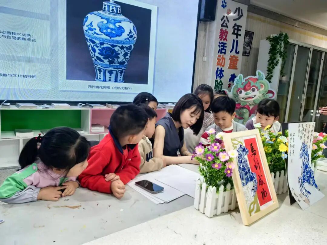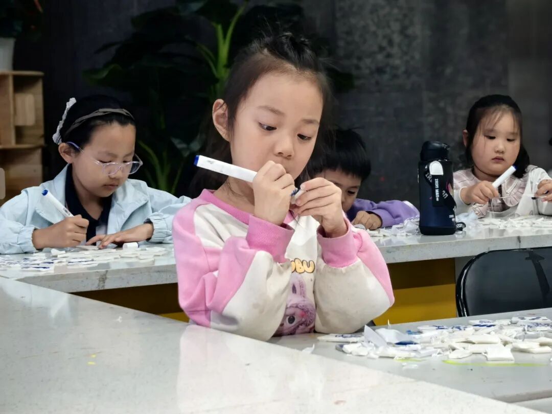 4月17日晚,泰安市美术馆(泰山画院)“星光星期五”活动如期举办。孩子们首先观察了青花瓷陶片上的古老纹样,感受蓝白美学的典雅与骏马的灵动姿态。随后,大家领到泡沫板一块块掰碎,这些凹凸不平的切面模拟了碎瓷片的独特肌理。