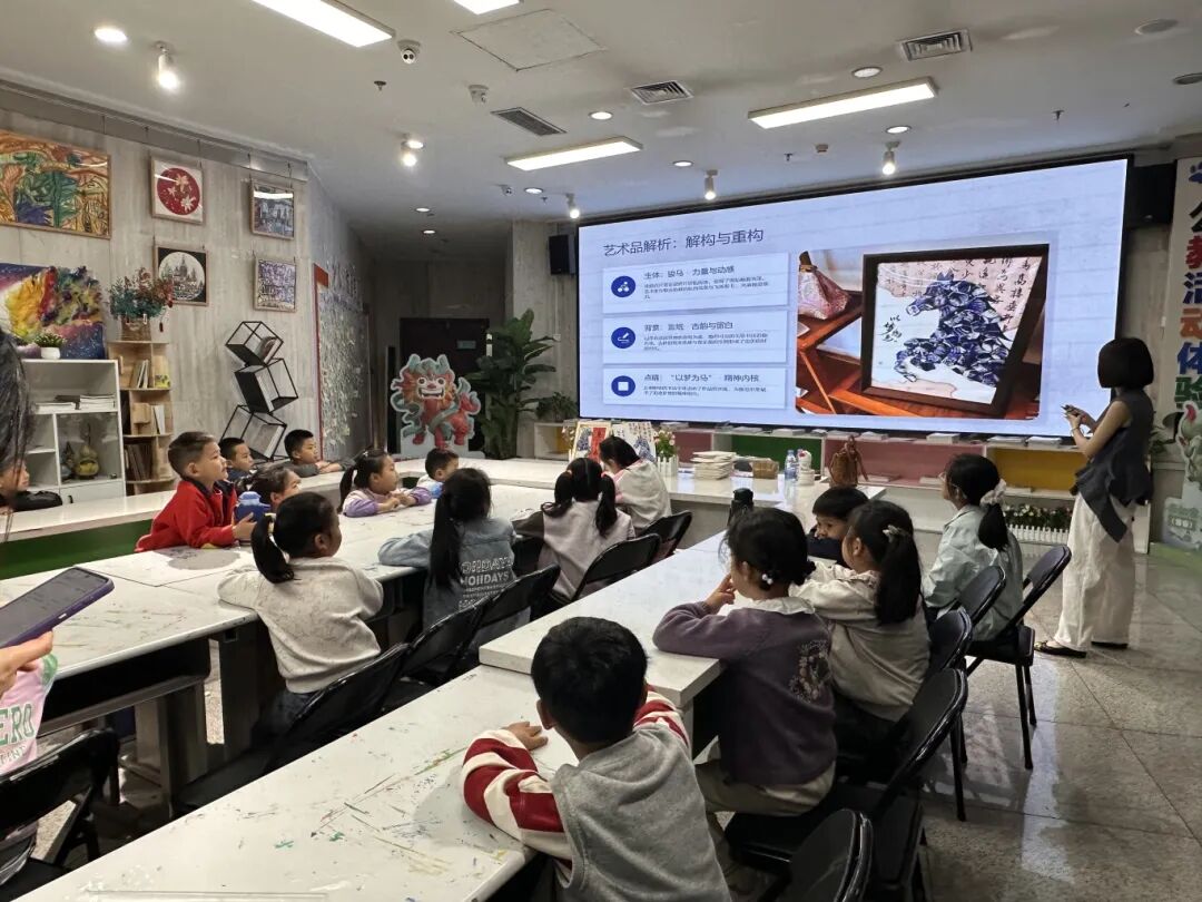 图注在泡沫板碎片上,孩子们用蓝色画笔认真描绘出缠枝莲、云气纹等青花瓷纹样。泡沫的粗糙质地让笔触呈现出别样的晕染效果,每一片“碎瓷”都成了充满手工艺味的创作单元。接着,大家将这些碎片拼贴组合,重新构筑成一匹匹昂首奔腾的骏马。综合材料的运用让骏马的造型充满力量与动感。孩子们在拼贴过程中锻炼了动手能力和构图思维,也理解了“变废为美”的环保创意。一匹匹蓝白相间的骏马意气风发,寄托着“马到成功”的美好寓意。以梦为马,艺术在指尖绽放。