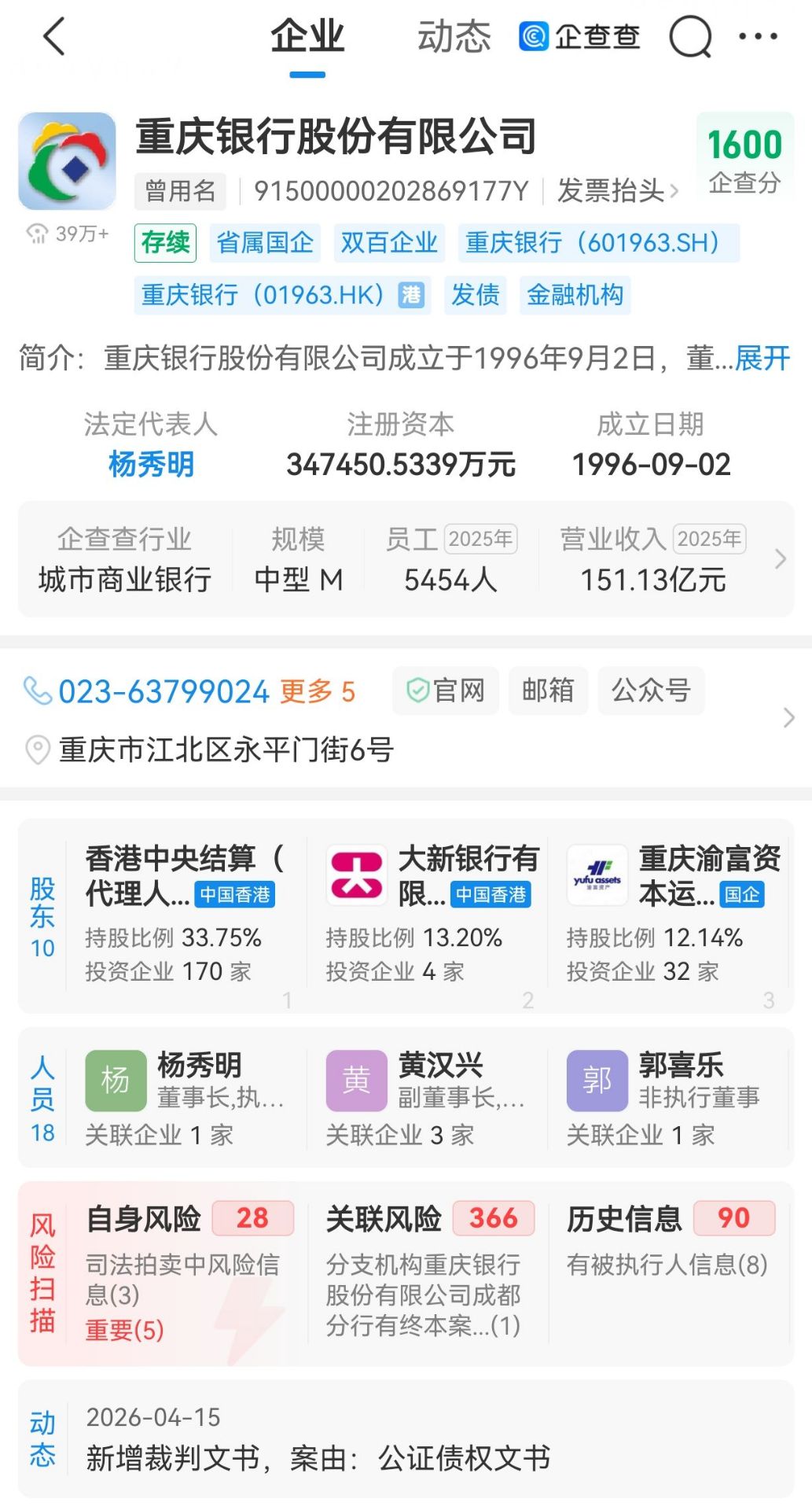 企查查显示,重庆银行成立于1996年。按照重庆市政府制定的增资扩股、资产重组、引资上市的“龙虾三吃”发展战略,2007年4月重庆银行顺利引进香港大新银行作为战略投资者,2013年11月在港交所挂牌上市,成为国内首家登陆H股的城商行。2016年4月重庆银行董事会决议通过A股上市议案,2021年2月成功登陆上交所主板,成为继郑州银行和青岛银行之后国内第3家A+H上市的城商行。