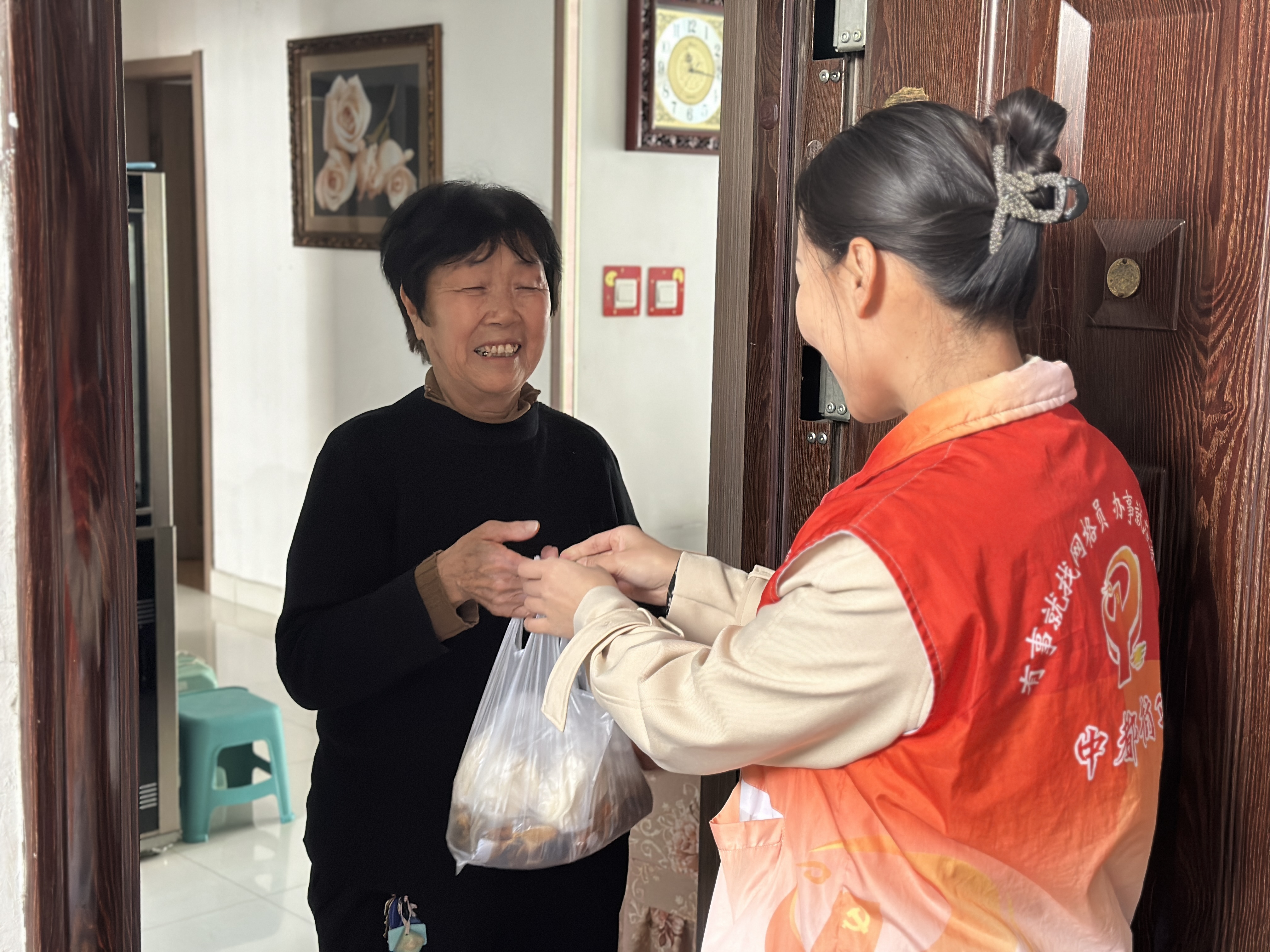 送餐过程中,社区志愿者化身“送餐使者”,按时将热乎的饭菜送到老人手中,同时耐心询问老人的身体状况和生活需求,叮嘱老人注意保暖、按时用餐,倾听老人的心声,及时解决老人的实际困难。一句句关切的问候,一份份暖心的饭菜,让老人们脸上露出了幸福的笑容。