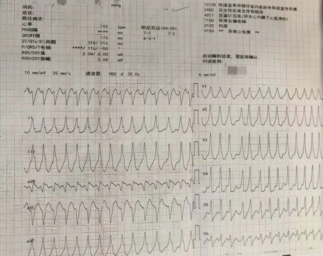 入院 10 小时前无诱因突发心慌、胸闷、持续性胸痛,急诊心电图提示:快速房颤,心率一度飙升至198 次 / 分,心律绝对不齐、第一心音强弱不等,更凶险的是:患者反复发作房颤伴预激前传,药物效果极差,同时容易诱发室颤或者心脏骤停,风险极大。