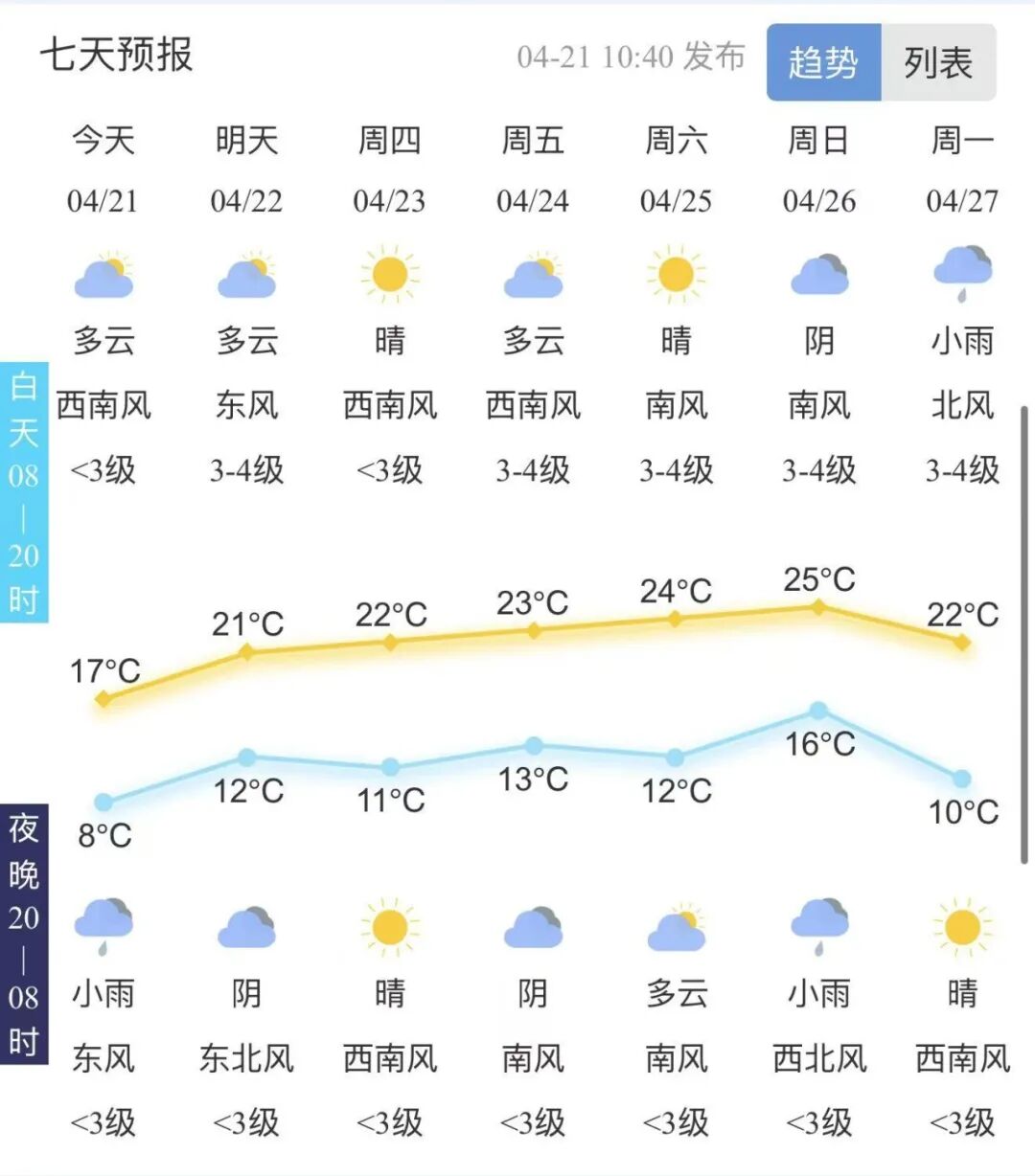 21日下午到22日白天,泰安和鲁南地区天气阴有小雨,聊城、济南、淄博、潍坊和青岛天气多云转阴局部有小雨,其他地区天气多云。滨州、东营、鲁中山区和半岛地区南风4~5级阵风6级减弱到3~4级,鲁南地区南风3~4级转北风4级阵风5~6级,其他地区南风3~4级。最低气温:聊城、德州和鲁中山区7℃左右,其他地区9℃左右。22日最高气温:济南、泰安、淄博、烟台和鲁西北地区21℃左右,临沂和日照15℃左右,其他地区18℃左右。
