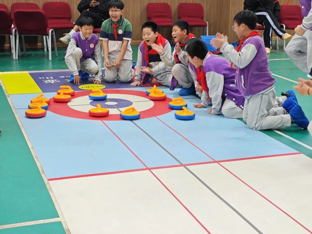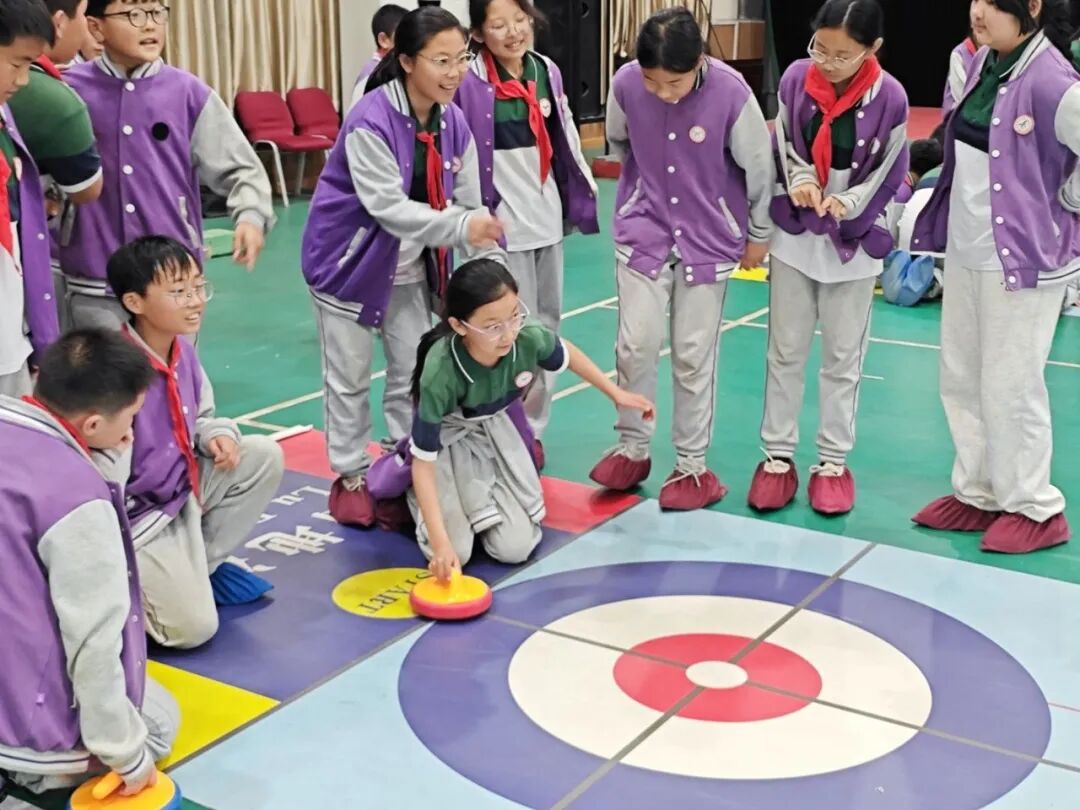 午后,学生们参与旱地冰壶项目。这项运动考验精准控制与团队配合,学生们分组竞技,分工协作,或进攻或防守,每一次精彩操作都引来阵阵欢呼声。五年级1班王子鸣感慨:“原来冰壶不是光靠力气,更要动脑筋和队友商量策略。”在一次次战术讨论中,学生们的团队意识悄然生根。