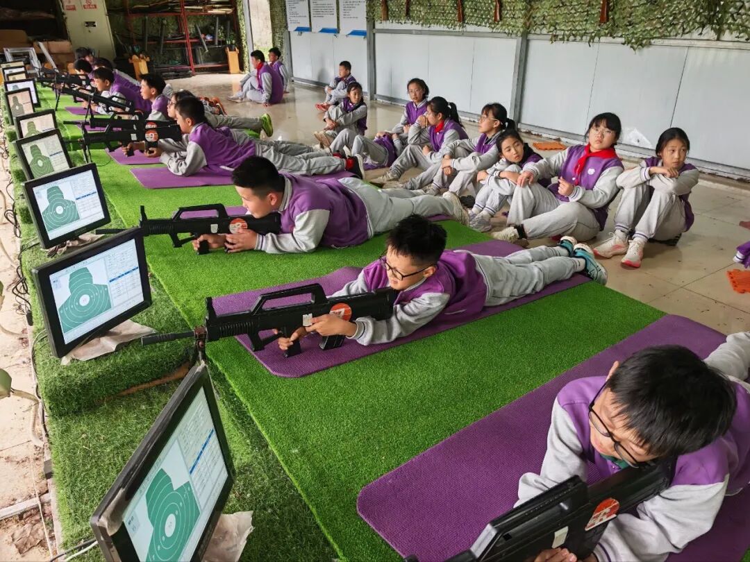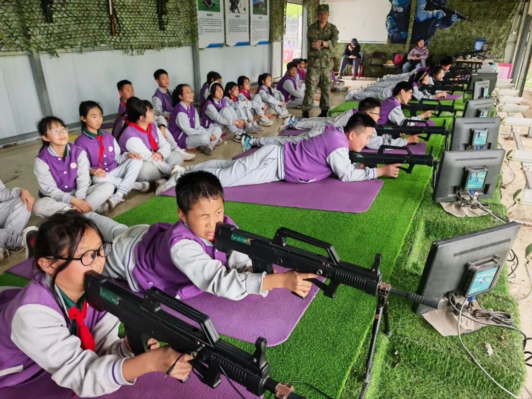 激光打靶环节中,教官向学生讲解国防知识和射击技巧,学生们屏息凝神,认真练习瞄准射击。激光枪虽无实弹,但对心态要求极高,稍有抖动便会脱靶。五年级4班刘若惜打出全场最高环数,她分享道:“要沉住气,慢慢扣扳机。”该项目让学生了解了军事知识,培养了沉着坚毅的品质。