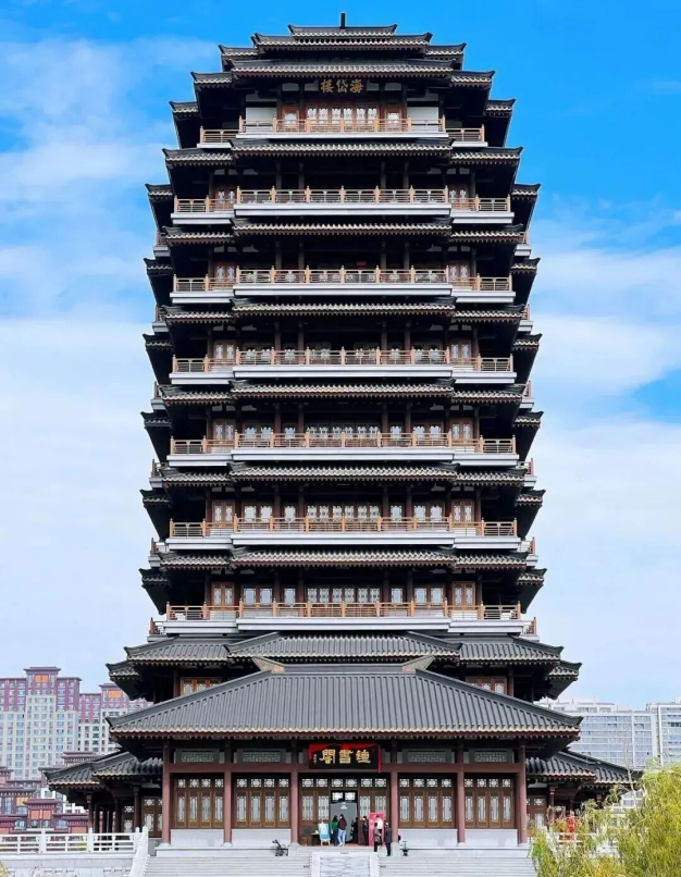 海岱楼坐落于齐盛湖公园,九层飞檐,气势沉雄。白日是湖畔一景,夜晚则化作城市灯塔,楼内更藏着一家“中国最美书店”——钟书阁。融汇淄博本土文化与现代思潮,“稷下争鸣”化作今朝雅集,“海岱日新”拓印齐风古韵,点亮城市文心,塑造区域文化高地。沉浸式齐风市井街区“海岱好市”更是打造出可触摸、可体验的文旅新场景。