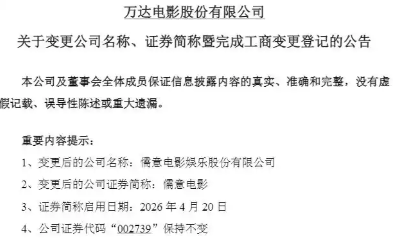 2026年4月19日晚间,万达电影股份有限公司公告称,公司已完成工商变更登记手续,并取得换发的《营业执照》。公司名称由“万达电影股份有限公司“变更为“儒意电影娱乐股份有限公司”,证券简称自4月20日起由“万达电影”变更为“儒意电影”,证券代码“002739”保持不变。