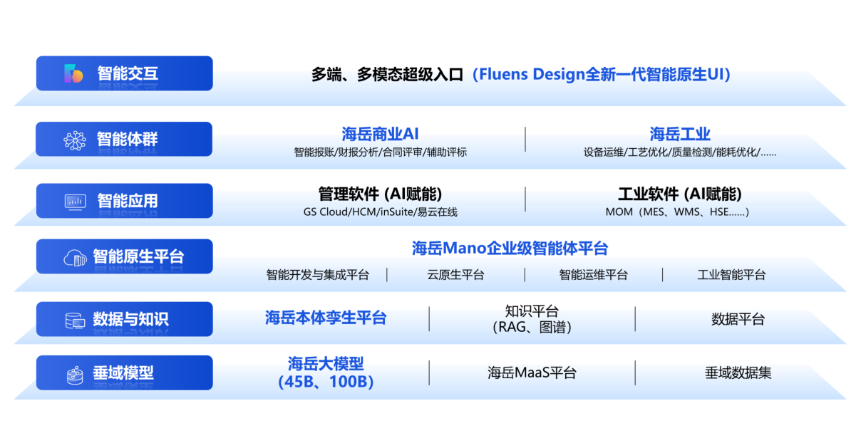 面向企业智能原生转型的核心需求,浪潮海岳全新重磅推出企业AI智能原生产品体系,基于全新一代智能原生软件架构与Fluens Design智能原生UI设计,涵盖商业AI、工业AI、Mano企业级智能体平台、本体孪生平台等核心产品,构建覆盖交互体验、平台底座、业务应用、数据知识的完整智能原生闭环,为企业释放AI价值、实现高质量数智化转型提供全新平台底座。