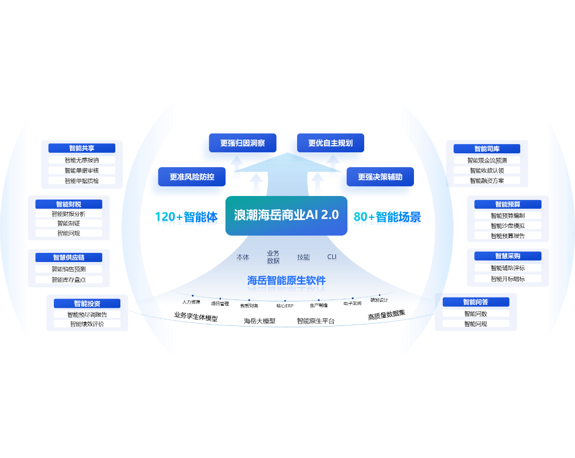 浪潮海岳商业AI 2.0聚焦企业经营管理全领域,覆盖财务共享、司库、税务、预算、供应链、资产等核心场景,包括智能无感报销、智能预算编制、智能财务报告、智能尽调报告、智能绩效评价、智能辅助评标等80+开箱即用智能场景及120+智能体。支撑企业打造“一人一助理,一人一分身”的数字员工团队,在确保安全合规前提下,自主完成任务规划执行、归因式洞察、精确风险识别和深度辅助决策等工作。