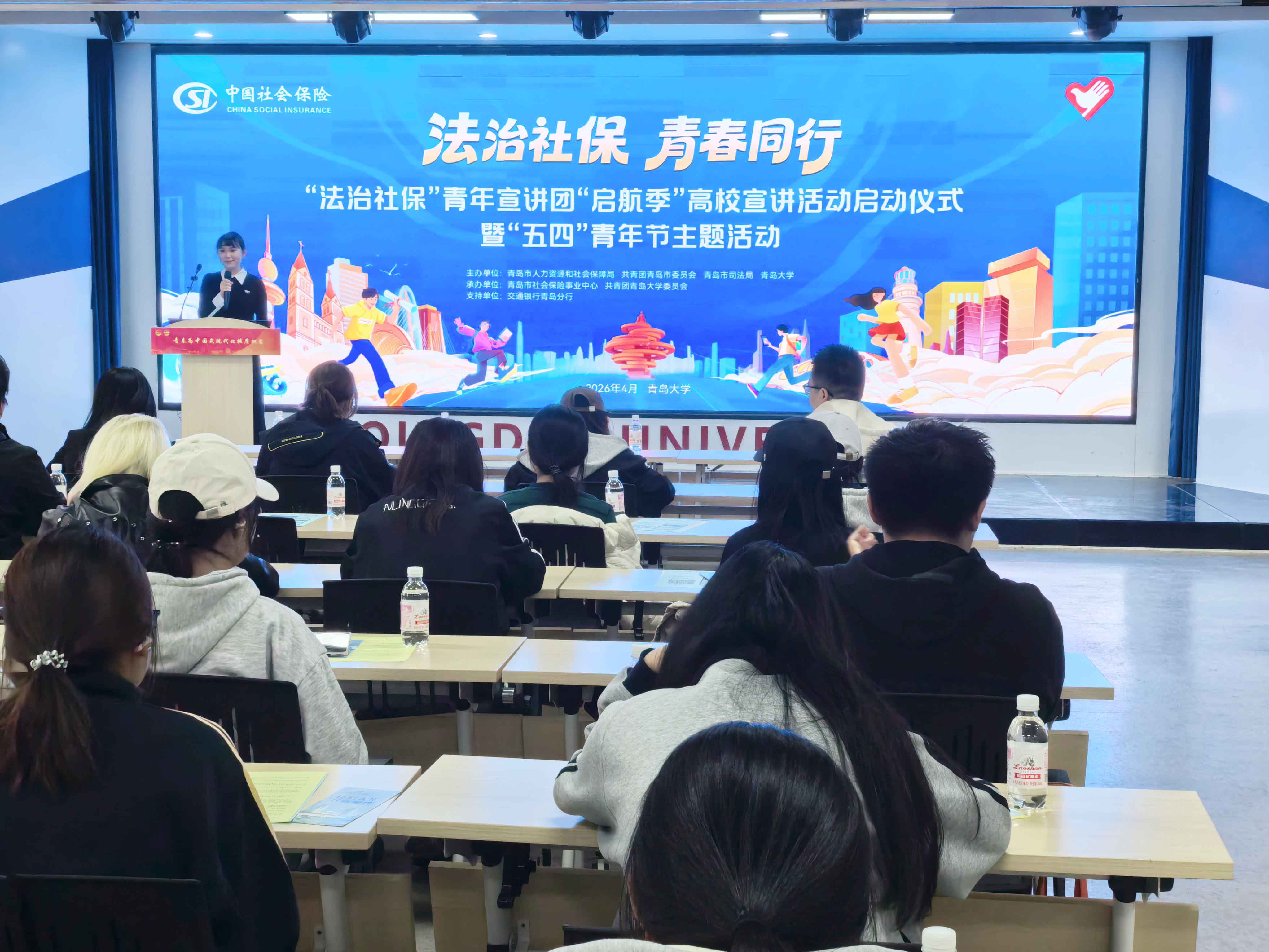 本次活动由青岛市人力资源和社会保障局联合共青团青岛市委、青岛市司法局共同举办,以青岛大学为首站,并陆续在驻青高校巡回宣讲,在毕业前夕,将量身定制的社保普法课送进大学校园,向毕业生普及参保知识,树立维权意识,助力走好职场“第一步”。