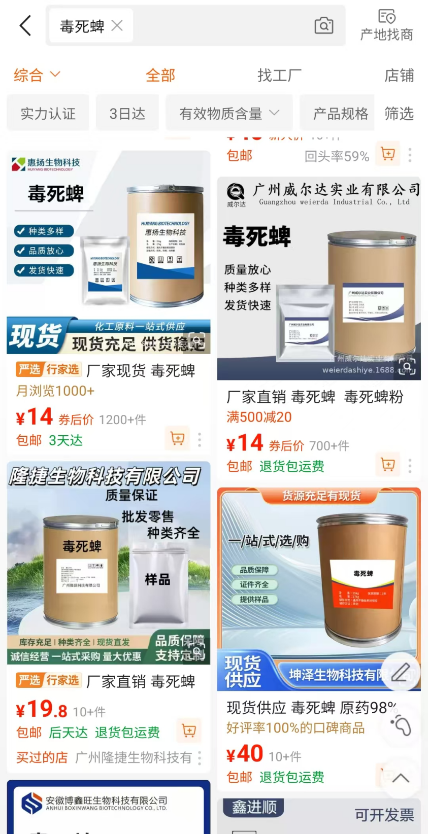 记者在京东输入“毒死蜱”,搜索栏下会出现“毒死蜱杀虫剂”“毒虱蜱”“毒虫蜱”等联想词。点击后,能发现一些商品标识“万能杀虫剂”“专杀顽固害虫”。记者向客服询问产品是否为毒死蜱时,客服马上给出了肯定的答复,且声称产品质量百分百合格,“如有不合格,小店假一赔十”。