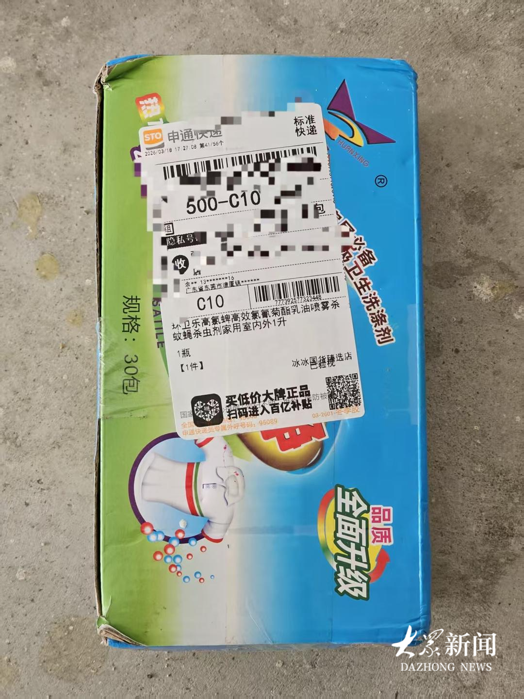记者分别从京东、阿里巴巴和拼多多三家购物平台下单了毒死蜱产品。收到货后,京东和阿里巴巴发出的快递包装没有任何标识,快递单上也没有有效的物品信息。拼多多发出产品的快递包装则是一款卫生洗涤剂盒子,快递单上的物品显示为“杀虫剂家用室内外1升”。