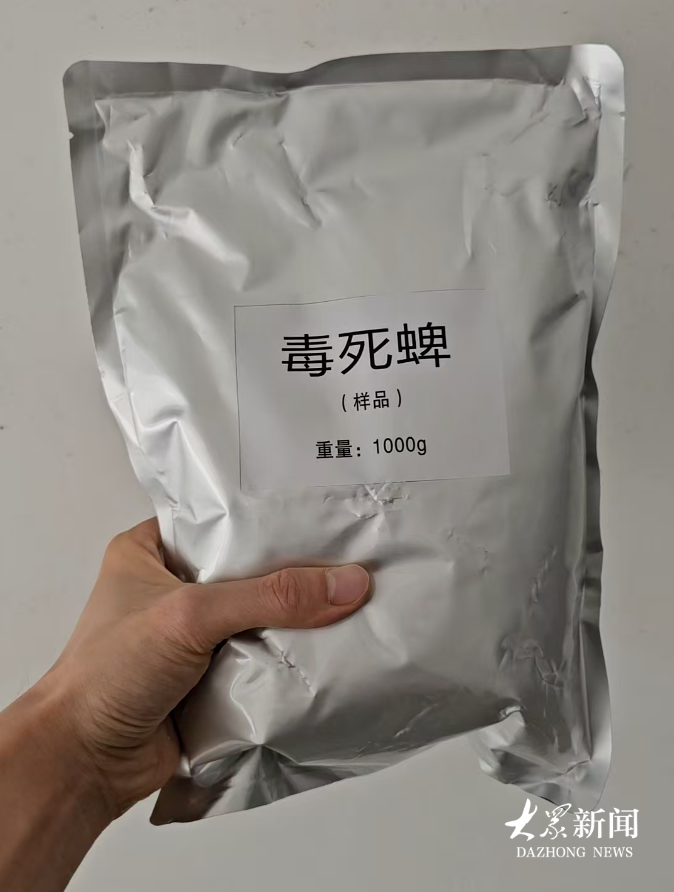 打开快递包装,从阿里巴巴购买的产品为银色复合材质的包装袋,仅贴有“毒死蜱(样品),重量:1000g”的标签。致电商家后对方表示,公司基本不对个人售卖,一般只会提供这类样品。