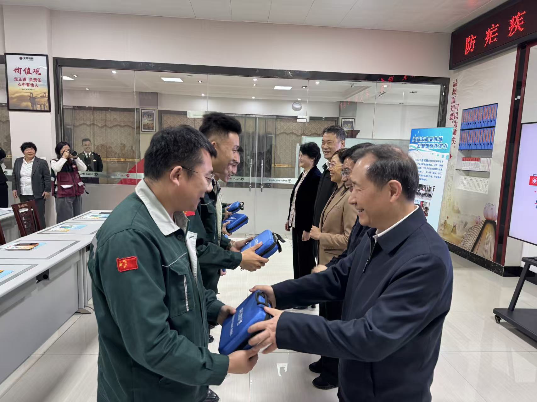 启动仪式结束后,省市区领导先后前往新兖中心卫生院、天意机械有限公司开展实地调研指导。在卫生院现场察看预防接种全流程演练、示教基地建设与运行管理情况;在企业深入了解出国务工员工疟疾防控措施落实情况,并为一线员工发放疟疾防护干预包,现场讲解使用方法及防护要点,切实把健康服务送到基层,送到岗位。