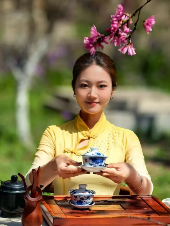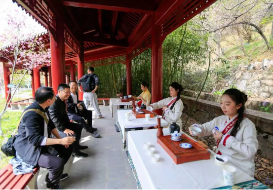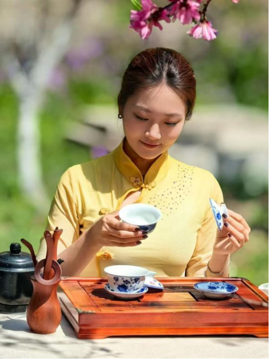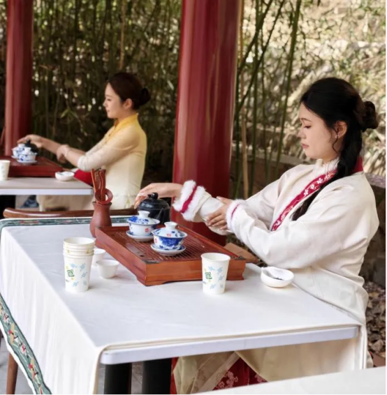 活动现场,财经系学子身着传统服饰,在彩石溪国风茶歇区整齐列队、从容展演。从温杯、置茶、注水、闷泡到奉茶、讲解,每一个动作规范流畅、优雅得体,充分展现了扎实的茶艺功底与良好的职业素养。学子们现场冲泡茉莉花茶、泰山女儿茶等特色茶品,为往来游客奉上温润茶汤,并细致讲解茶叶知识、冲泡技巧、饮茶礼仪与中华茶文化内涵,让游客在赏桃花、观国乐、游溪谷的同时,沉浸式感受 “曲水流觞、品茗听风” 的中式雅致意境。茶香与花香交融,技艺与服务共生,驻足茶席的游客们纷纷点赞,称赞学子们服务热情、讲解专业,让春日游园更具文化韵味。