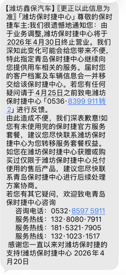 2026年4月20日,谷雨。对于潍坊的保时捷车主而言,这个春天的尾巴并不平静。当天,一则短信通知打破了车友群里的宁静:潍坊保时捷中心将于2026年4月30日终止营业。济南的保时捷历城中心刚在3月关停,潍坊的门店又在4月降下旗帜,这是保时捷在华渠道战略主动调整的一个缩影,也折射出传统豪华品牌在中国市场的深刻变局。