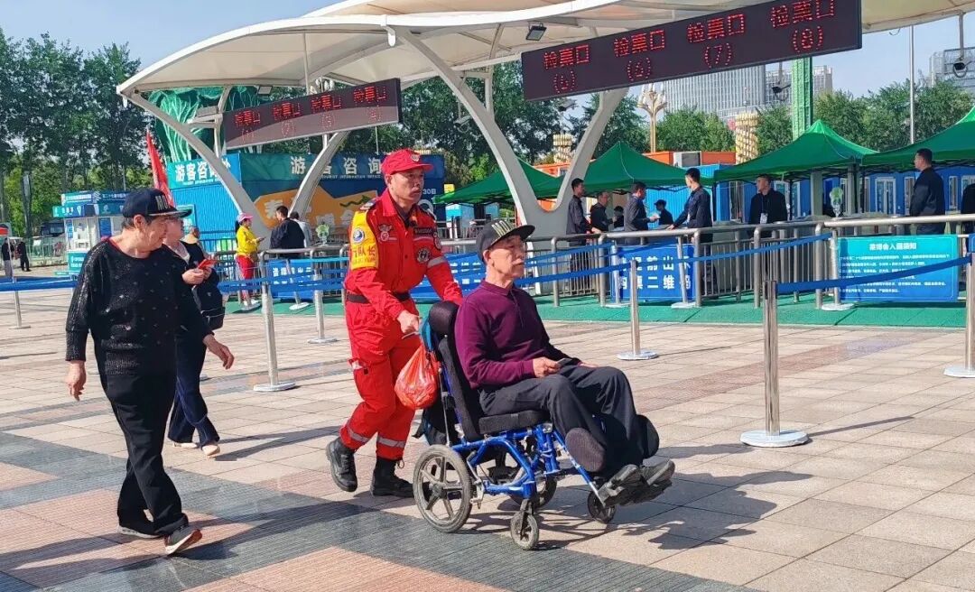 在检票口周边,弥水志愿者肩负着协助检票、秩序维护与重点帮扶的职责。他们为行动不便者、老年人等开启绿色通道,提供“一对一”贴心服务,或推行轮椅,或全程陪护,确保每位游客顺利入园。面对大客流,他们积极疏导,耐心解释票务问题,用爱心与责任成为检票口最坚实的温情守护者。