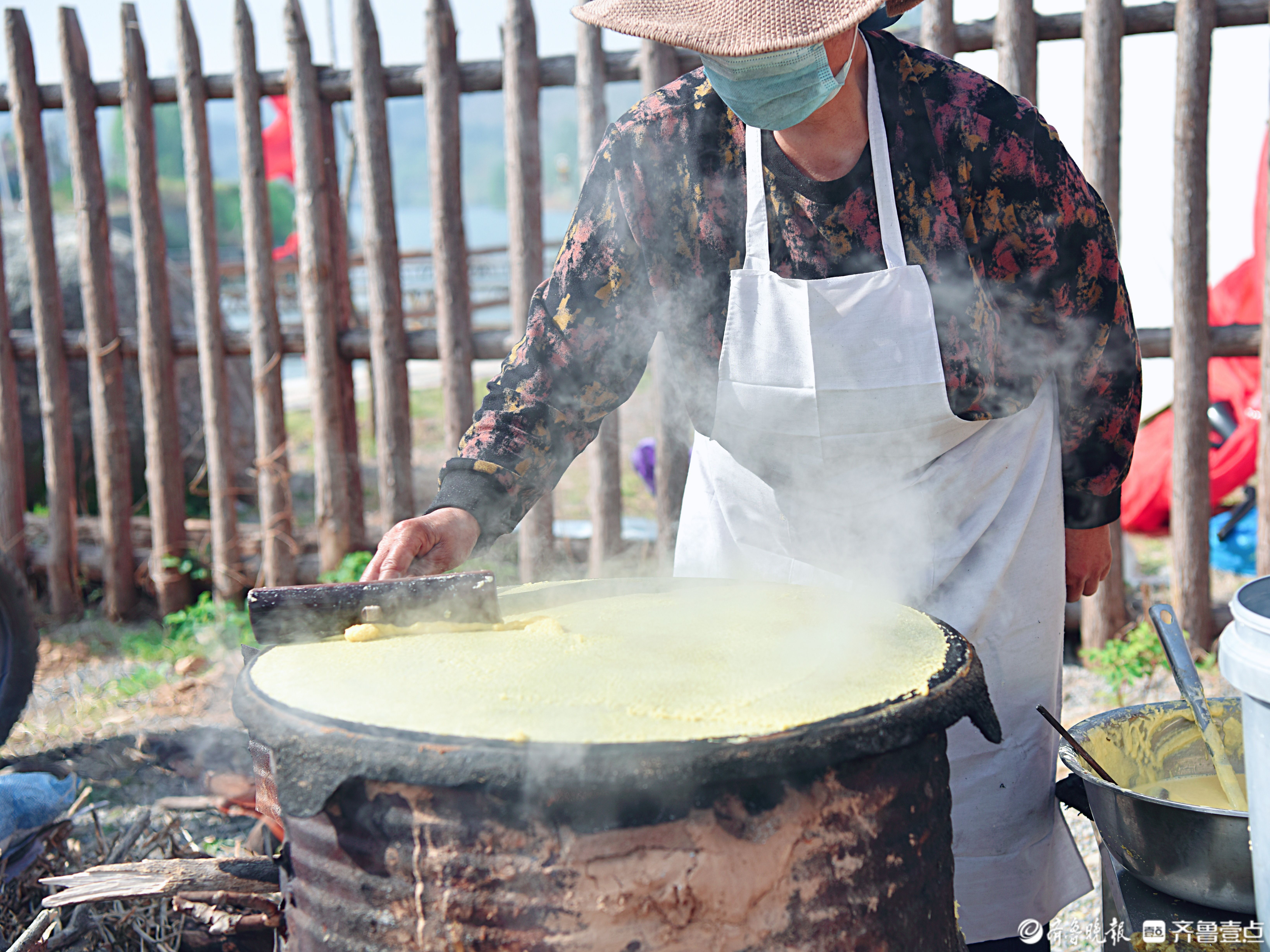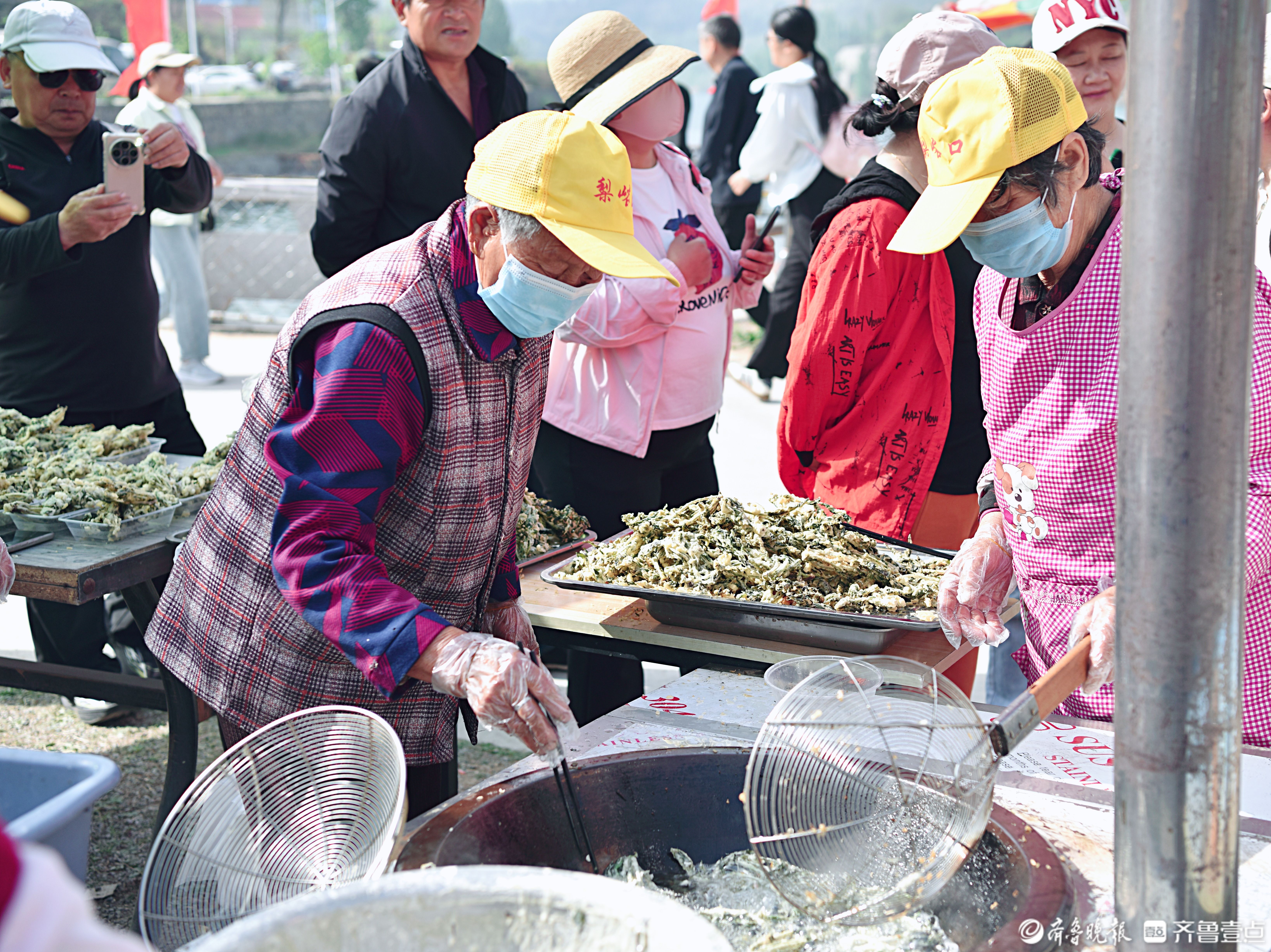4月18日,淄博市淄川区西河镇梨峪口村村民正在炸椿芽。当日,淄博市第三届香椿文化旅游节在梨峪口村开幕。手工摊煎饼、炸椿芽、烙槐花、炖蘑菇等传统小吃亮相,80名志愿者现场免费服务,助力乡村振兴。闫盛霆王恩行摄