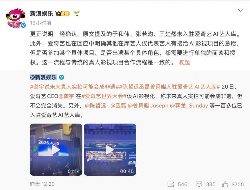 4月21日凌晨,新浪娱乐通过微博发布更正说明:“经确认,原文提及的于和伟、张若昀、王楚然未入驻爱奇艺AI艺人库”。