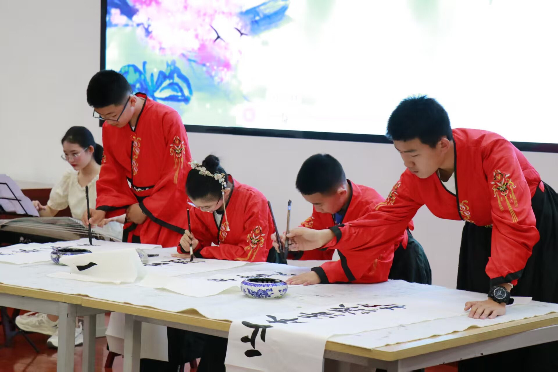 活动伊始,与会人员共同观看了全民阅读与版权保护宣传片。随后,文艺展演轮番登场,学校师生代表带来诗朗诵《在春天扶着诗歌行走》,以饱满情感展现文字力量;古筝演奏与现场书法创作巧妙融合,尽显中华优秀传统文化魅力;小提琴合奏《梁祝》用经典旋律传递文学艺术的永恒价值;海阳市朗读协会带来诗朗诵《青春中国》,弘扬爱国主义精神,将现场氛围推向高潮。