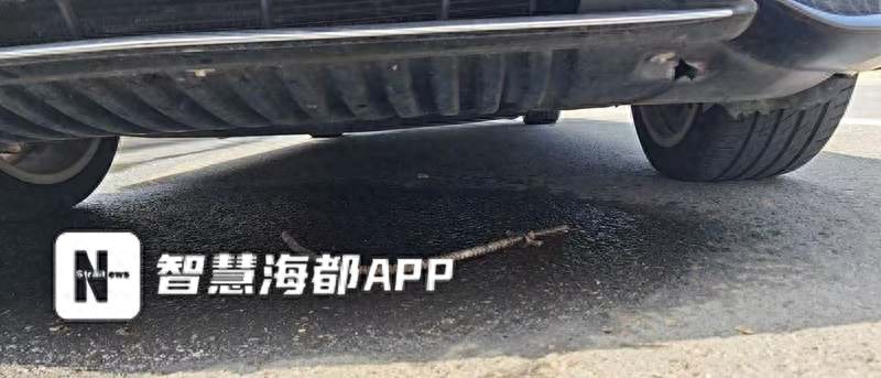 俞先生告诉记者,3月27日中午11点多,他驾车行至南三环快速路浦口新城段时,车辆底盘突然传来异响,随即仪表盘指示灯异常亮起。他立刻靠边停车检查,发现一根遗留在路面上的钢筋,将底盘撞破了一个洞,“水一直往外流”。