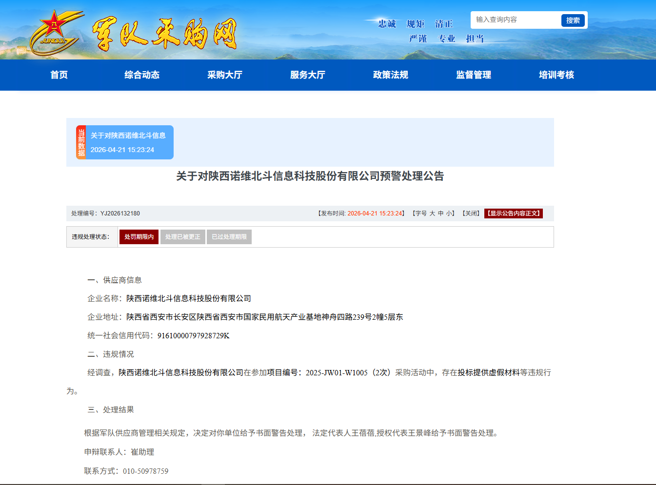 4月21日,军队采购网发布关于对陕西诺维北斗信息科技股份有限公司预警处理公告。处理编号:YJ2026132180显示,经调查,陕西诺维北斗信息科技股份有限公司在参加项目编号:2025-JW01-W1005(2次)采购活动中,存在投标提供虚假材料等违规行为。