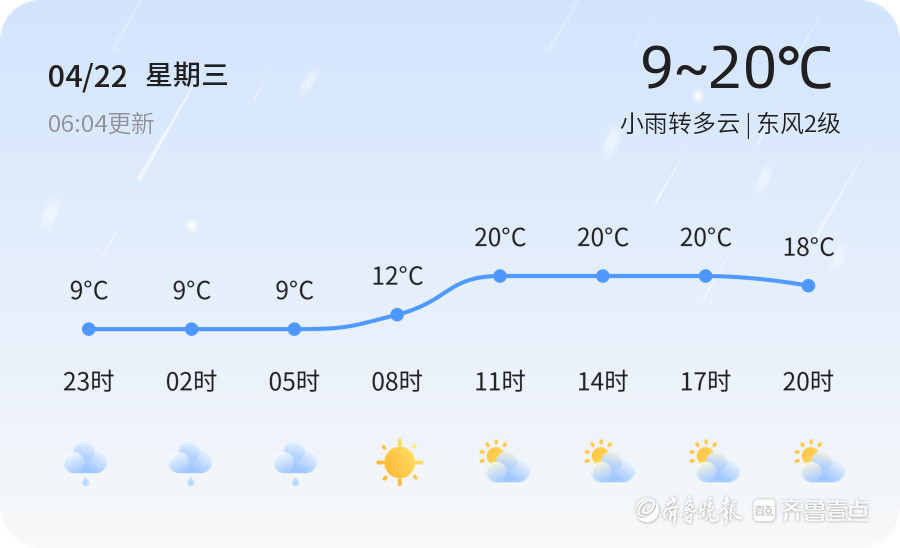 今天是4月22日,星期三,农历三月初六。泰安市今天迎来小雨转多云的天气,气温在9℃至20℃之间,东风2级,空气湿度为86%。空气质量状况良好,PM2.5指数为26,属于优级水平。早晨气温较低,市民出行请注意保暖,雨天路滑,建议携带雨具,注意交通安全。 未来三天,泰安市天气将以多云为主,气温逐渐回升,最高温度可达22℃,最低温度维持在9℃左右。预计24日天气转晴,风力逐渐增强。市民需注意昼夜温差较大,适时增减衣物,避免感冒。 提示当前正值春季天气多变时期,市民需关注天气预报,合理安排出行。雨天出行时,驾驶员应保持车距,减速慢行,确保行车安全。此外,空气湿度较大,易引发呼吸道疾病,体质较弱者需注意防护。 本周泰安市天气整体呈现回暖趋势,气温波动幅度较大,市民出行前建议查看实时天气情况,合理规划行程。未来一周,天气将以晴到多云为主,偶有小雨天气,市民需做好相应的准备工作,确保生活和工作不受影响。