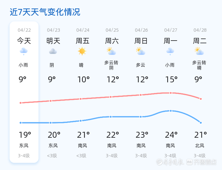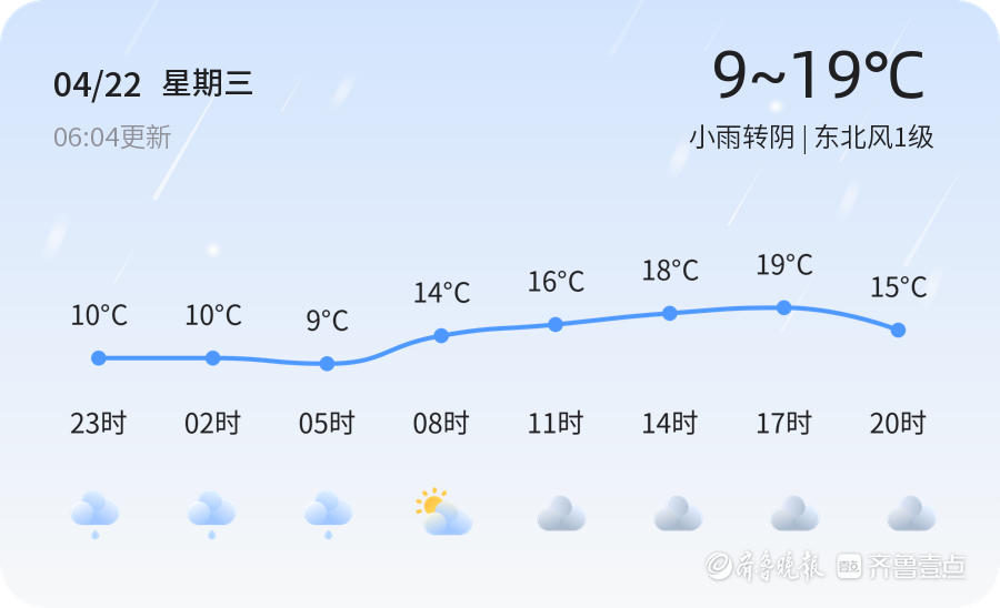 今天是4月22日,星期三,农历三月初六。济宁市今日天气以小雨转阴为主,气温在9℃至19℃之间,东北风1级。各区天气情况基本一致,降雨主要集中在上午时段,雨量较小,对市民出行影响不大。空气质量良好,PM2.5指数为25,适合户外活动。市民朋友们请注意携带雨具,以防突如其来的降雨。