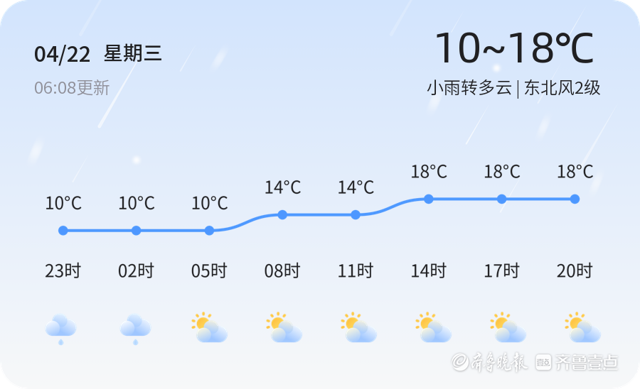 今天是4月22日,星期三,农历三月初六。菏泽市今日天气为小雨转多云,气温在10℃至18℃之间,东北风2级,空气湿度较高,达95%。目前空气质量状况为优,PM2.5指数为32,适宜户外活动。早晨气温较低,市民出行请注意保暖,雨天路滑,驾车请保持车距,确保行车安全。
