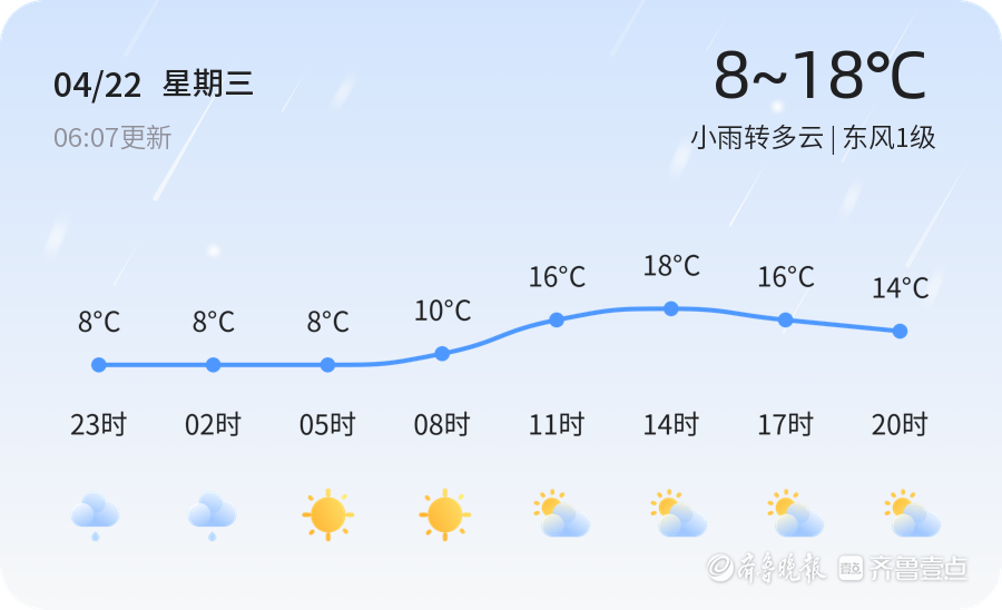 今天是4月22日,星期三,农历三月初六。聊城市今日天气为小雨转多云,气温范围在8℃至18℃之间。目前实时温度为7.7℃,风向为东风1级,空气湿度高达97%,PM2.5浓度为25,空气质量为优级。今日的降雨可能会对早高峰交通造成一定影响,建议市民出行时携带雨具,注意交通安全。