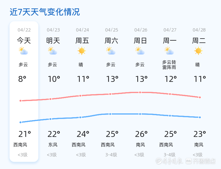 今天是4月22日,星期三,农历三月初六。滨州今日天气以多云为主,气温介于8℃至21℃之间,目前温度为9.2℃,风向为西风1级,空气湿度较高,达到88%,PM2.5指数为62,空气质量良好。各区天气情况基本一致,均为多云,气温变化不大,市民出行需注意适时添减衣物。