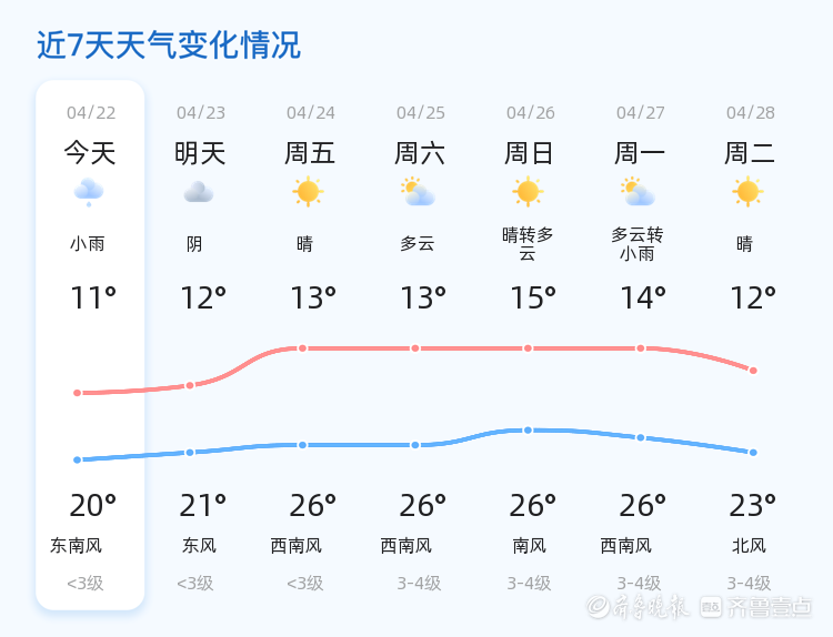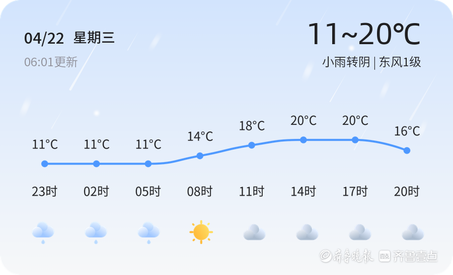 今日是4月22日,星期三,农历三月初六。淄博市今日天气为小雨转阴,气温介于11℃至20℃之间,目前气温为8.2℃,东风1级,空气湿度较高,为92%,PM2.5指数为20,空气质量良好。各区县天气情况基本一致,均以小雨转阴为主,风力较弱,适宜市民外出活动。