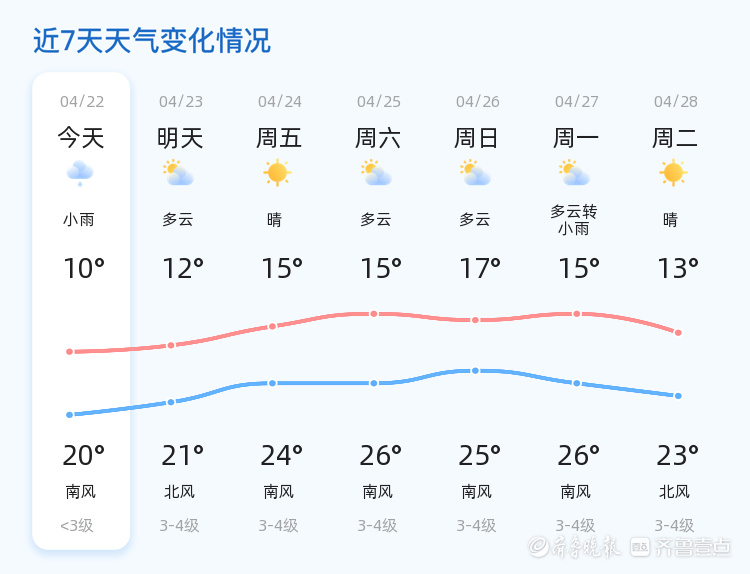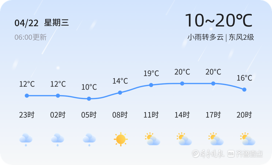 今天是4月22日,星期三,农历三月初六。济南市今日天气以小雨转多云为主,气温在10℃至20℃之间,东风2级,空气湿度91%,PM2.5指数24,空气质量良好。各区天气情况总体平稳,降雨主要集中在早晨和上午时段,随后逐渐转为多云天气。