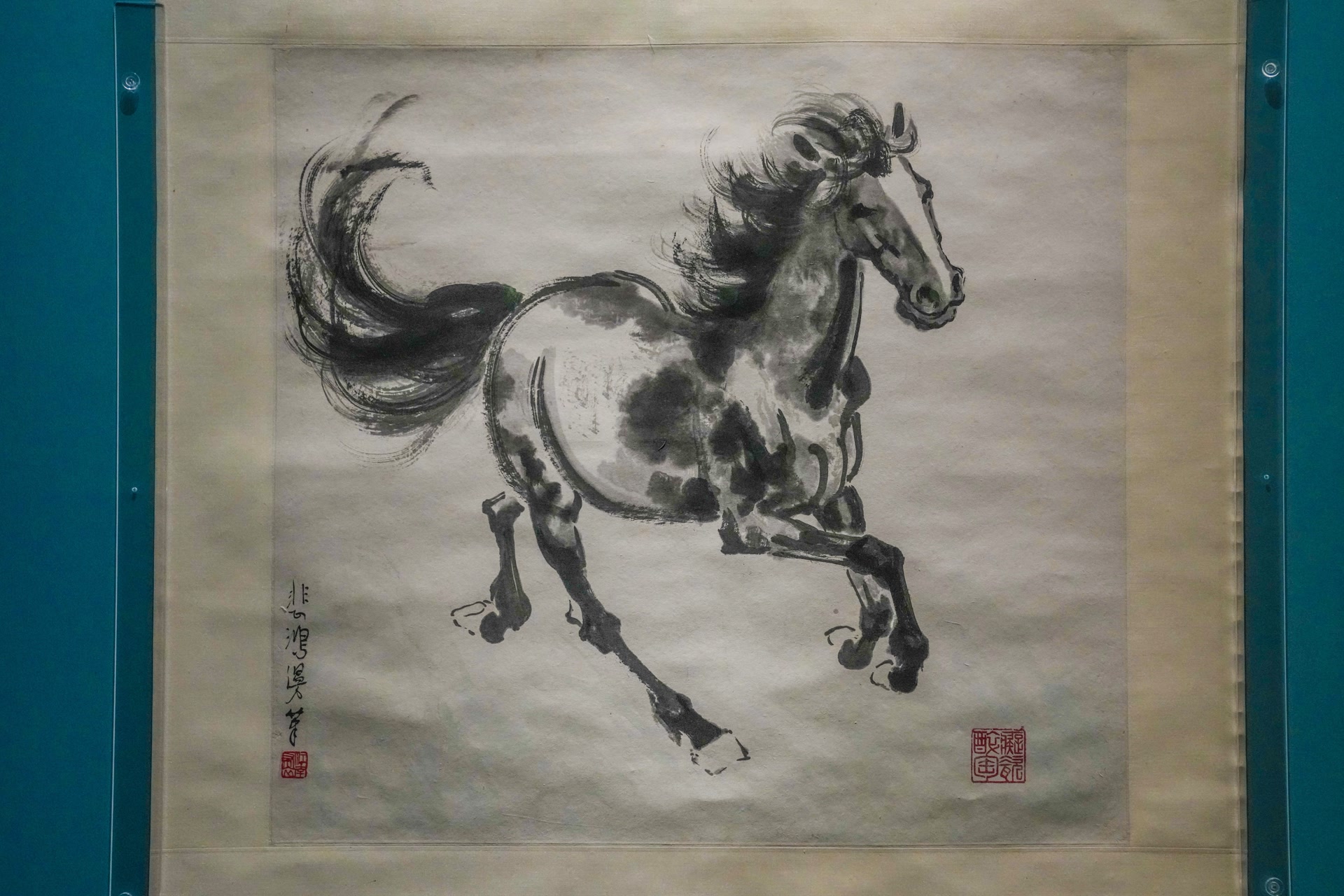 图为徐悲鸿《奔马图》轴。李公麟《摹韦偃牧放图》称得上“断层顶流”,独享“C位”展柜。纵46.2厘米、横429.8厘米的绢本上,就是一个实打实的“马世界”:高低不平的土坡和广阔的平原间,牧者驱赶着大群马匹蜂拥而来,马嘶人叫;随后,马群逐渐散开,有的低头觅食,有的追赶嬉闹,有的奔跑,有的就地翻滚。牧人形象也生动有趣,有的穿戴整齐,有的则敞胸露怀赤足。整个画面的构图,前半部拥塞、紧张,后半部疏散、松弛,富有节奏感。