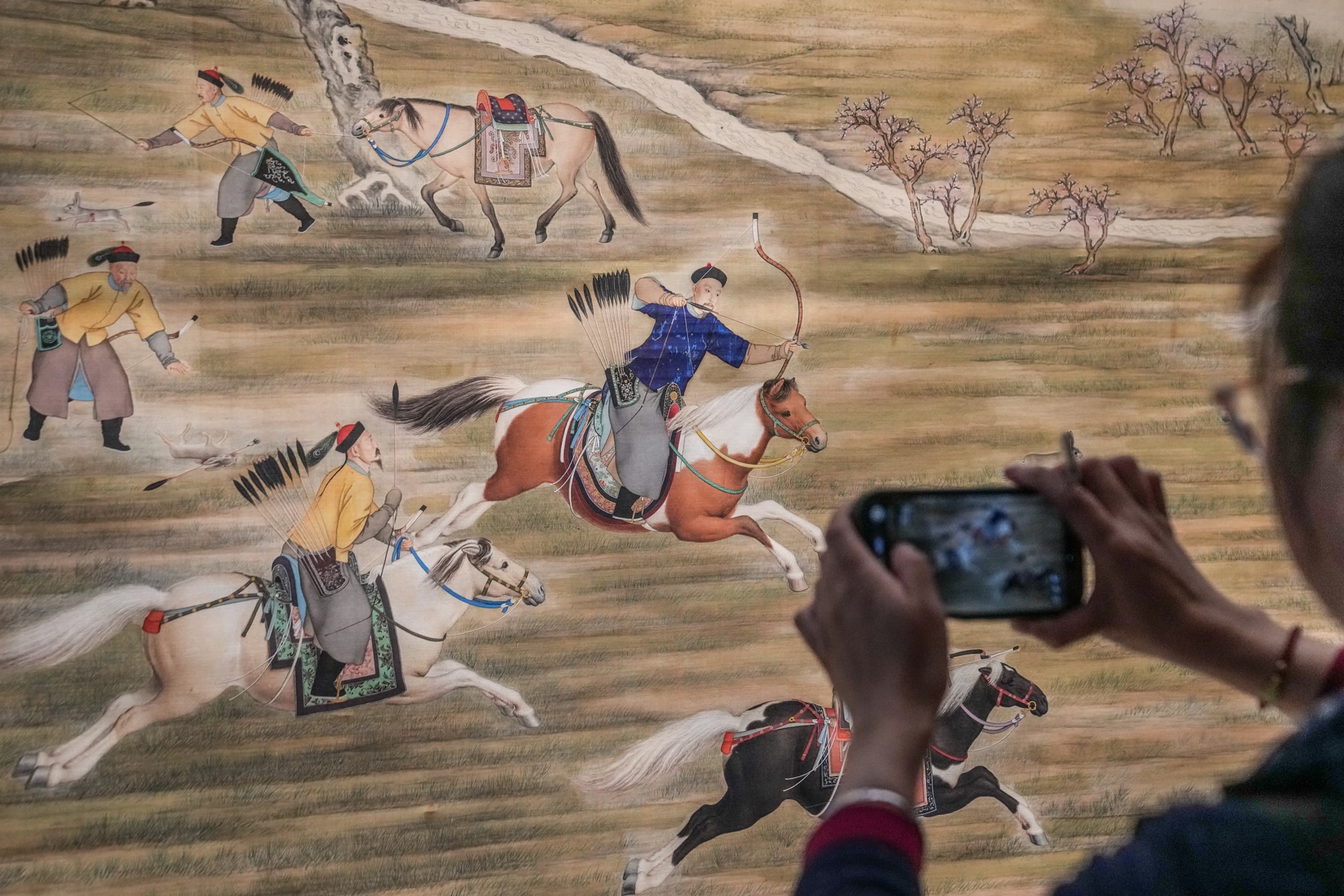 “神骏:故宫书画艺术中的马世界”展厅内,参观者在清代郎世宁《弘历射猎图》前驻足。马顺平透露,画面上有汉、满、蒙三种语言标注马匹信息。但有些数据并不准确。郎世宁在绘画时应该做了修正,画中马的比例非常和谐。